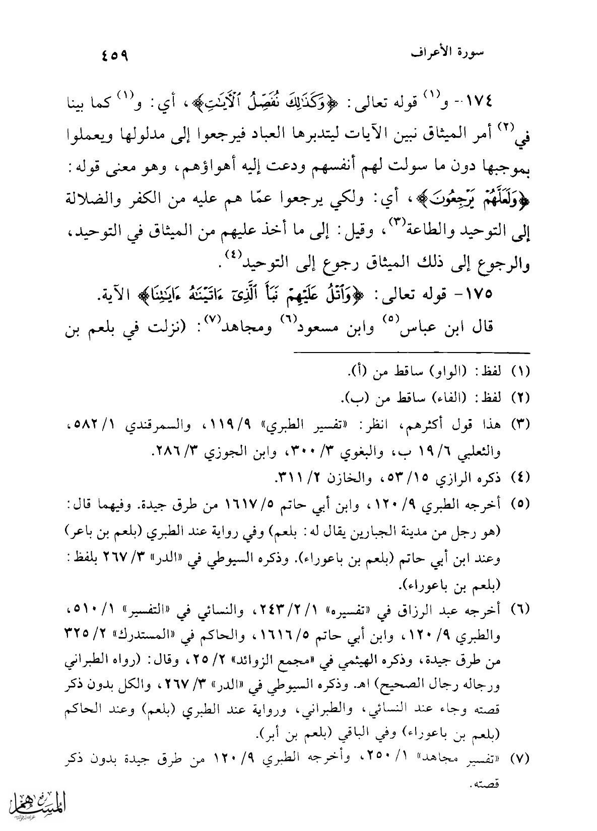 (6) أخرجه عبد الرزاق في "تفسيره" 1/ 2/243، والنسائي في "التفسير" 1/ 510، والطبري 9/ 120، وابن أبي حاتم 5/ 1616، والحاكم في "المستدرك" 2/ 325 من طرق جيدة، وذكره الهيثمي في "مجمع الزوائد" 2/ 25، وقال: (رواه الطبراني ورجاله رجال الصحيح) اهـ. وذكره السيوطي في "الدر" 3/ 267، والكل بدون ذكر قصته وجاء عند النسائي، والطبراني، ورواية عند الطبري (بلعم) وعند الحاكم (بلعم بن باعوراء) وفي الباقي (بلعم بن أبر).