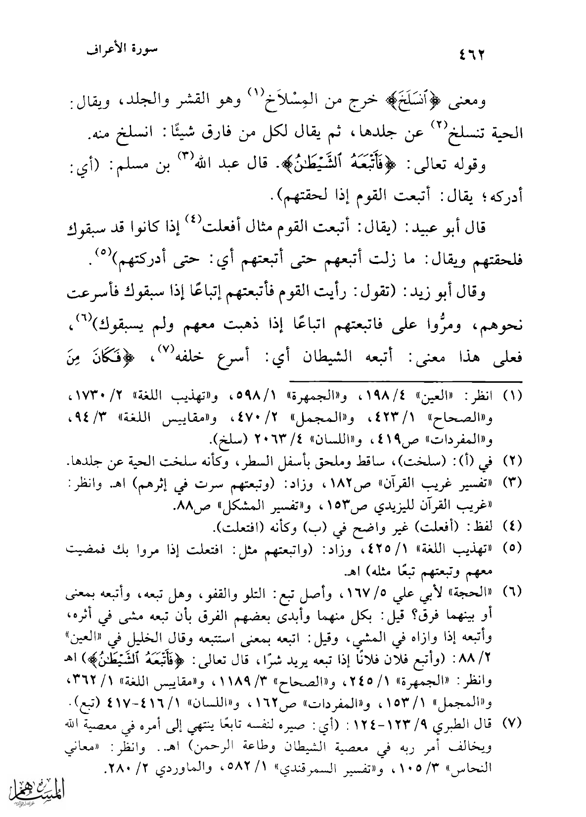 (¬6) "الحجة" لأبي علي 5/ 167، وأصل تبع: التلو والقفو، وهل تبعه، وأتبعه بمعنى أو بينهما فرق؟ قيل: بكل منهما وأبدى بعضهم الفرق بأن تبعه مشى في أثره, وأتبعه إذا وازاه في المشي، وقيل: اتبعه بمعنى استتبعه وقال الخليل في "العين" 2/ 88: (وأتبع فلان فلانًا إذا تبعه يريد شرًا، قال تعالى: {فَأَتْبَعَهُ الشَّيْطَانُ}) اهـ وانظر: "الجمهرة" 1/ 245، و"الصحاح" 3/ 1189، و"مقاليس اللغة" 1/ 362، و"المجمل" 1/ 153، و"المفردات" ص 162، و"اللسان" 1/ 416 - 417 (تبع).