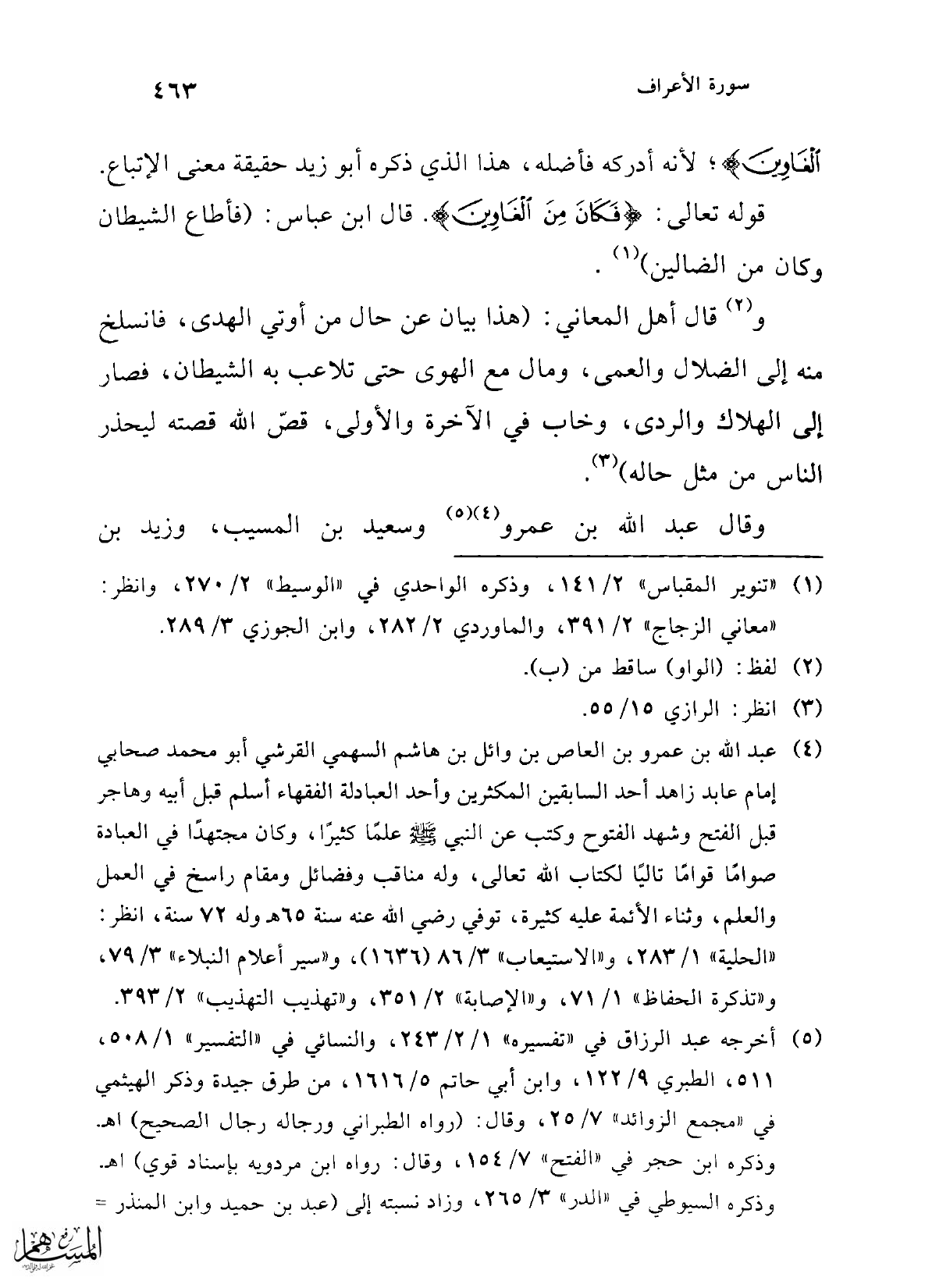 (¬4) عبد الله بن عمرو بن العاص بن وائل بن هاشم السهمي القرشي أبو محمد صحابي إمام عابد زاهد أحد السابقين المكثرين واحد العبادلة الفقهاء أسلم قبل أبيه وهاجر قبل الفتح وشهد الفتوح وكتب عن النبي - صلى الله عليه وسلم - علمًا كثيرًا، وكان مجتهدًا في العبادة صوامًا قوامًا تاليًا لكتاب الله تعالى، وله مناقب وفضائل ومقام راسخ في العمل والعلم، وثناء الأئمة عليه كثيرة، توفي رضي الله عنه سنة 65 هـ. وله 72 سنة، انظر: "الحلية" 1/ 283، و"الاستيعاب" 3/ 86 (1636)، و"سير أعلام النبلاء" 3/ 79، و"تذكرة الحفاظ" 1/ 71، و"الإصابة" 2/ 351، و"تهذيب التهذيب" 2/ 393.