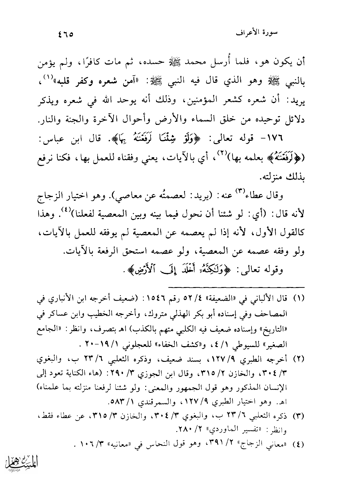 (¬2) أخرجه الطبري 9/ 127، بسند ضعيف، وذكره الثعلبي 6/ 23 ب، والبغوي 3/ 304، والخازن 2/ 315، وقال ابن الجوزي 3/ 290: (هاء الكناية تعود إلى الإنسان المذكور وهو قول الجمهور والمعنى: ولو شئنا لرفعنا منزلته بما علمناه) اهـ. وهو اختيار الطبري 9/ 127، والسمرقندي 1/ 583.