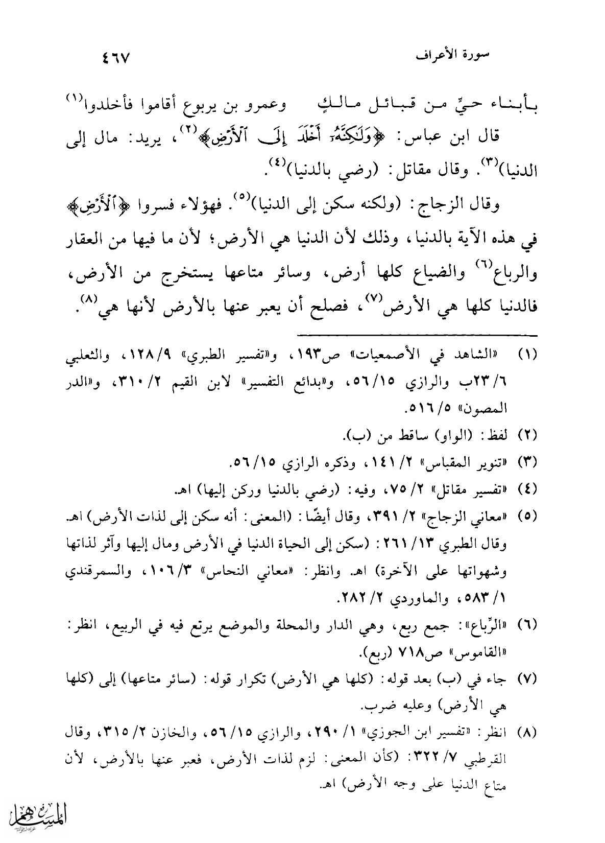 (¬8) انظر: "تفسير ابن الجوزي" 1/ 290، والرازي 15/ 56، والخازن 2/ 315، وقال القرطبي 7/ 322: (كأن المعنى: لزم لذات الأرض، فعبر عنها بالأرض، لأن متاع الدنيا على وجه الأرض) اهـ.
