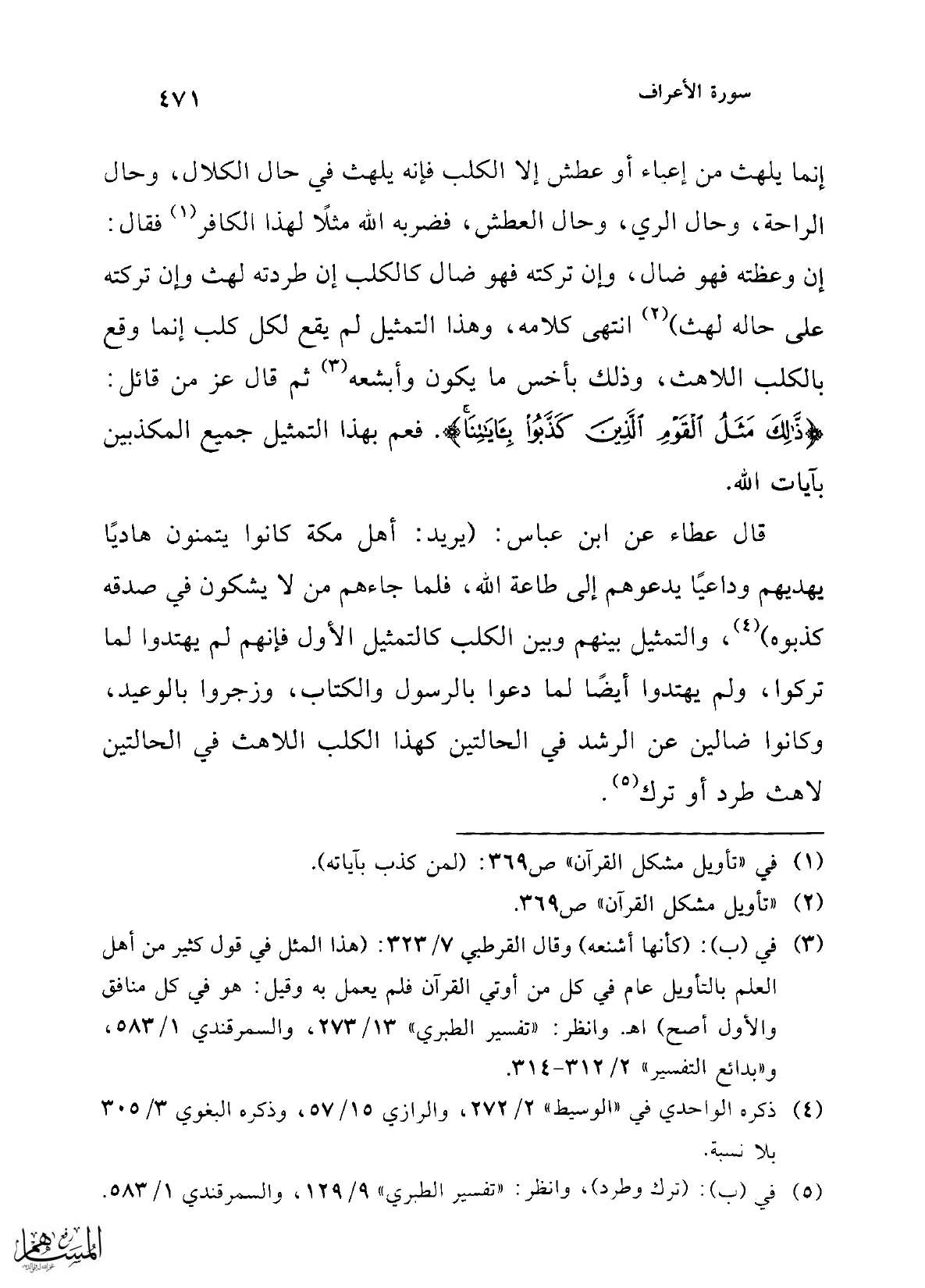 قال عطاء عن ابن عباس: (يريد: أهل مكة كانوا يتمنون هاديًا يهديهم وداعيًا يدعوهم إلى طاعة الله، فلما جاءهم من لا يشكون في صدقه كذبوه) (¬4)، والتمثيل بينهم وبين الكلب كالتمثيل الأول فإنهم لم يهتدوا لما تركوا، ولم يهتدوا أيضًا لما دعوا بالرسول والكتاب، وزجروا بالوعيد، وكانوا ضالين عن الرشد في الحالتين كهذا الكلب اللاهث في الحالتين لاهث طرد أو ترك (¬5).
