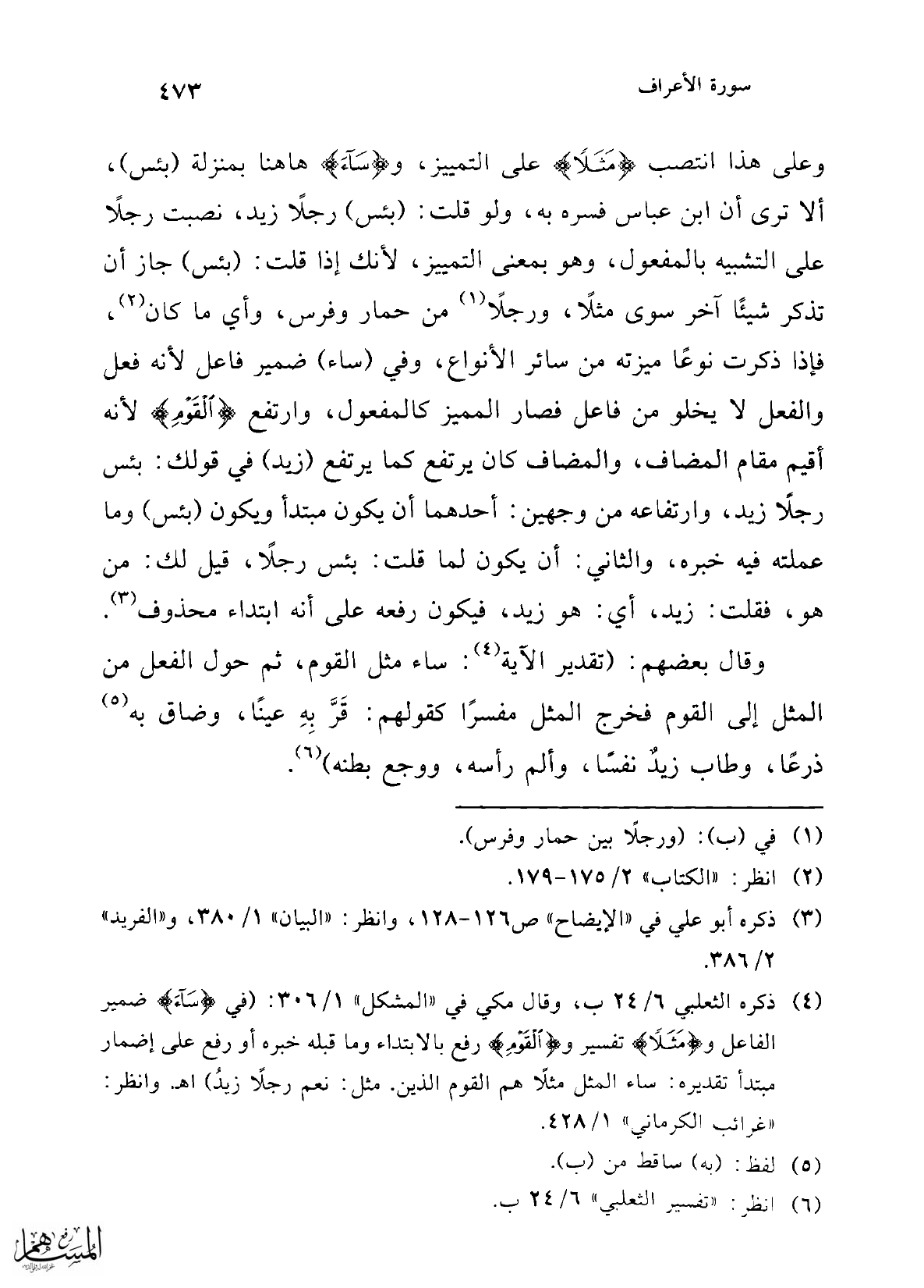 (¬4) ذكره الثعلبي 6/ 24 ب، وقال مكي في "المشكل" 1/ 306: (في {سَاءَ} ضمير الفاعل و {مَثَلًا} تفسير و {الْقَوْمُ} رفع بالابتداء وما قبله خبره أو رفع على إضمار مبتدأ تقديره: ساء المثل مثلاً هم القوم الذين. مثل: نعم رجلاً زيدُ) اهـ. وانظر: "غرائب الكرماني" 1/ 428