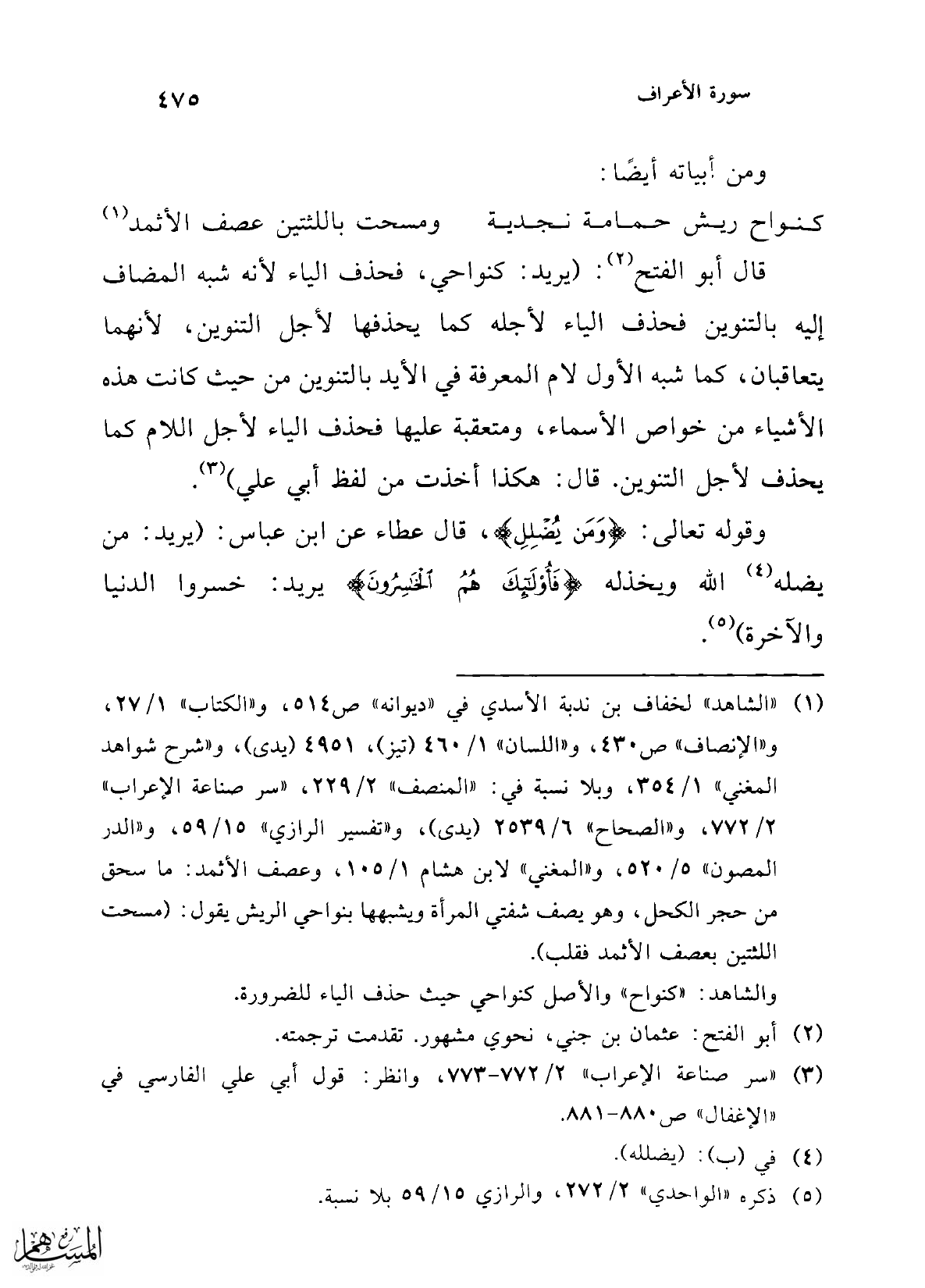 قال أبو الفتح (¬2): (يريد: كنواحي، فحذف الياء لأنه شبه المضاف إليه بالتنوين فحذف الياء لأجله كما يحذفها لأجل التنوين، لأنهما يتعاقبان، كما شبه الأول لام المعرفة في الأيد بالتنوين من حيث كانت هذه الأشياء من خواص الأسماء، ومتعقبة عليها فحذف الياء لأجل اللام كما يحذف لأجل التنوين. قال: هكذا أخذت من لفظ أبي علي) (¬3).