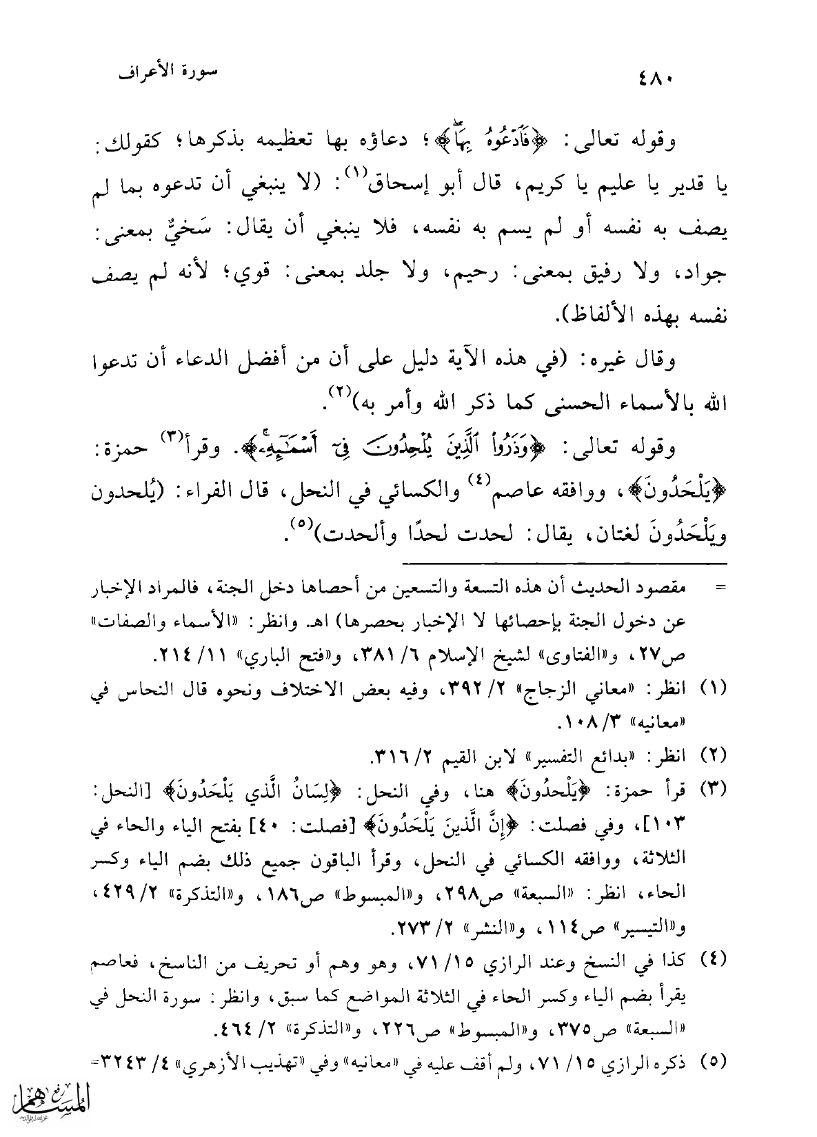 وقوله تعالى: {فَادْعُوهُ بِهَا}؛ دعاؤه بها تعظيمه بذكرها؛ كقولك: يا قدير يا عليم يا كريم، قال أبو إسحاق (¬1): إلا ينبغي أنا تدعوه بما لم يصف به نفسه أو لم يسم به نفسه، فلا ينبغي أن يقال: سَخيٌّ بمعنى: جواد، ولا رفيق بمعنى: رحيم، ولا جلد بمعنى: قوي؛ لأنه لم يصف نفسه بهذه الألفاظ).