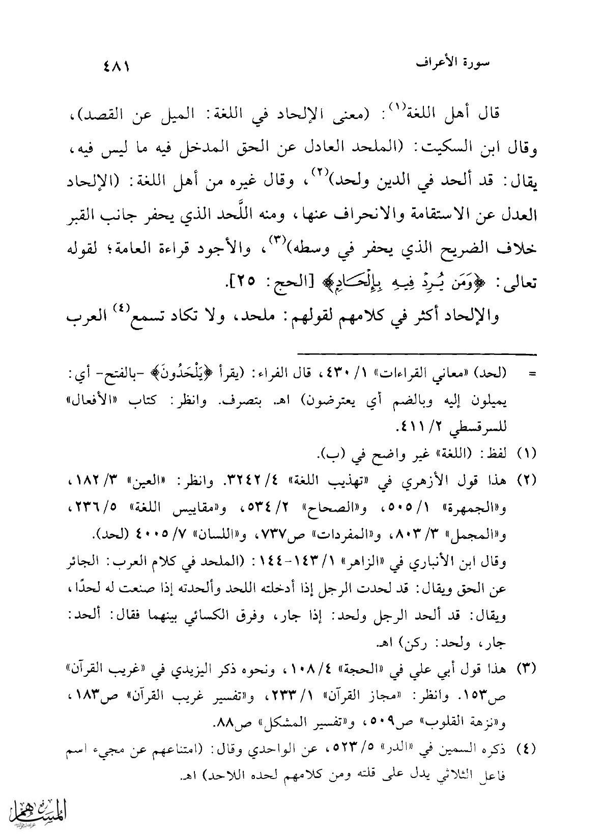 = (لحد) "معاني القراءات" 1/ 430، قال الفراء: (يقرأ {يُلْحِدُونَ} -بالفتح- أي: يميلون إليه وبالضم أي يعترضون) اهـ. بتصرف. وانظر: كتاب "الأفعال" للسرقسطي 2/ 411.