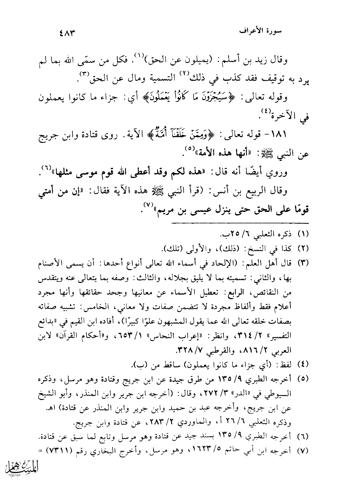 181 - قوله تعالى: {وَمِمَّنْ خَلَقْنَا أُمَّةٌ} الآية. روى قتادة وابن جريج عن النبي - صلى الله عليه وسلم -: "أنها هذه الأمة" (¬5).