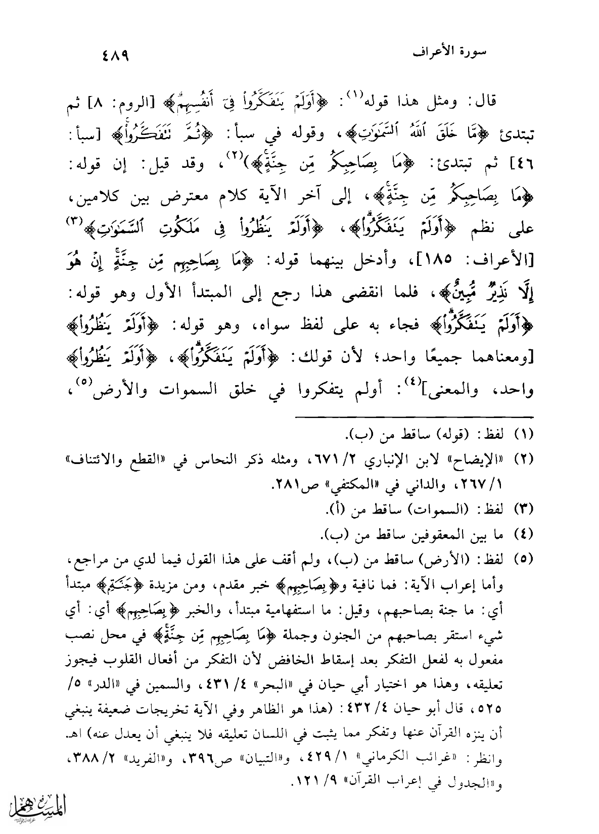 (¬5) لفظ: (الأرض) ساقط من (ب)، ولم أقف على هذا القول فيما لدي من مراجع، وأما إعراب الآية: فما نافية و {بِصَاحِبِهِمْ} خبر مقدم، ومن مزيدة {جِنَّةٍ} مبتدأ أي: ما جنة بصاحبهم، وقيل: ما استفهامية مبتدأ، والخبر {بِصَاحِبِهِمْ} أي: أي شيء استقر بصاحبهم من الجنون وجملة {مَا بِصَاحِبِهِمْ مِنْ جِنَّةٍ} في محل نصب مفعول به لفعل التفكر بعد إسقاط الخافض لأن التفكر من أفعال القلوب فيجوز تعليقه، وهذا هو اختيار أبي حيان في "البحر" 4/ 431، والسمين في "الدر" 5/ 525، قال أبو حيان 4/ 432: (هذا هو الظاهر وفي الآية تخريجات ضعيفة ينبغي أن ينزه القرآن عنها وتفكر مما يثبت في اللسان تعليقه فلا ينبغي أن يعدل عنه) اهـ. وانظر: "غرائب الكرماني"1/ 429، و"التبيان" ص 396، و"الفريد" 2/ 388، و"الجدول في إعراب القرآن" 9/ 121.