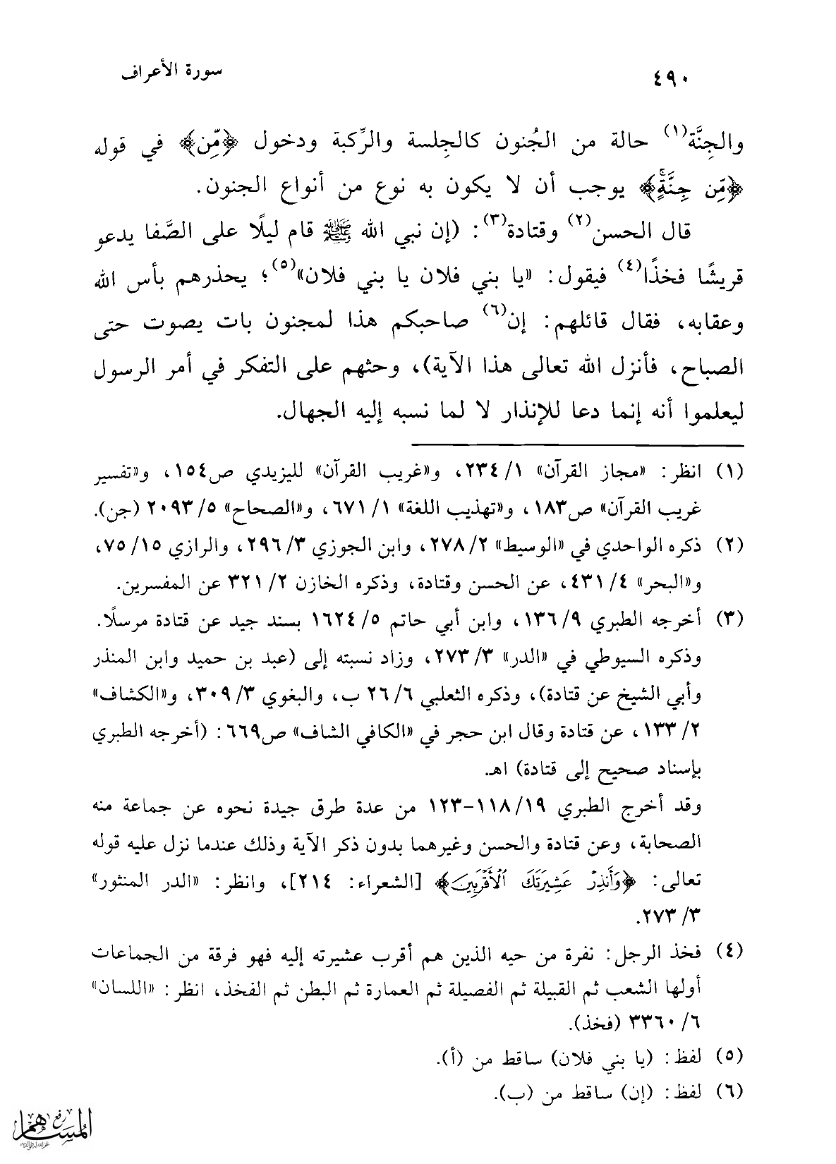 قال الحسن (¬2) وقتادة (¬3): (إن نبي الله - صلى الله عليه وسلم - قام ليلاً على الصَّفا يدعو قريشًا فخذًا (¬4) فيقول: "يا بني فلان يا بني فلان" (¬5)؛ يحذرهم بأس الله وعقابه، فقال قائلهم: إن (¬6) صاحبكم هذا لمجنون بات يصوت حتى الصباح، فأنزل الله تعالى هذا الآية)، وحثهم على التفكر في أمر الرسول ليعلموا أنه إنما دعا للإنذار لا لما نسبه إليه الجهال.