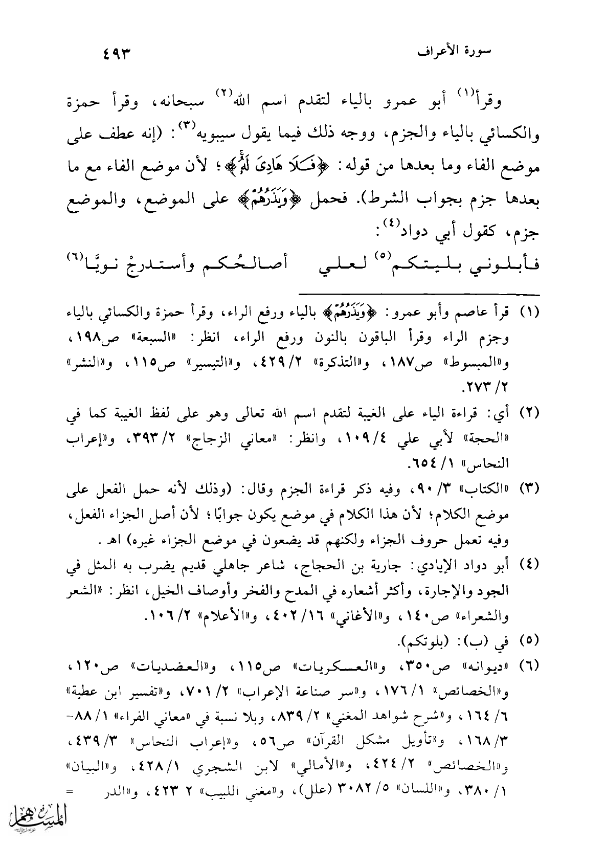 وقرأ (¬1) أبو عمرو بالياء لتقدم اسم الله (¬2) سبحانه، وقرأ حمزة والكسائي بالياء والجزم، ووجه ذلك فيما يقول سيبويه (¬3): (إنه عطف على موضع الفاء وما بعدها من قوله: {فَلَا هَادِيَ لَهُ}؛ لأن موضع الفاء مع ما بعدها جزم بجواب الشرط). فحمل {وَيَذَرُهُمْ} على الموضع، والموضع جزم، كقول أبي دواد (¬4):