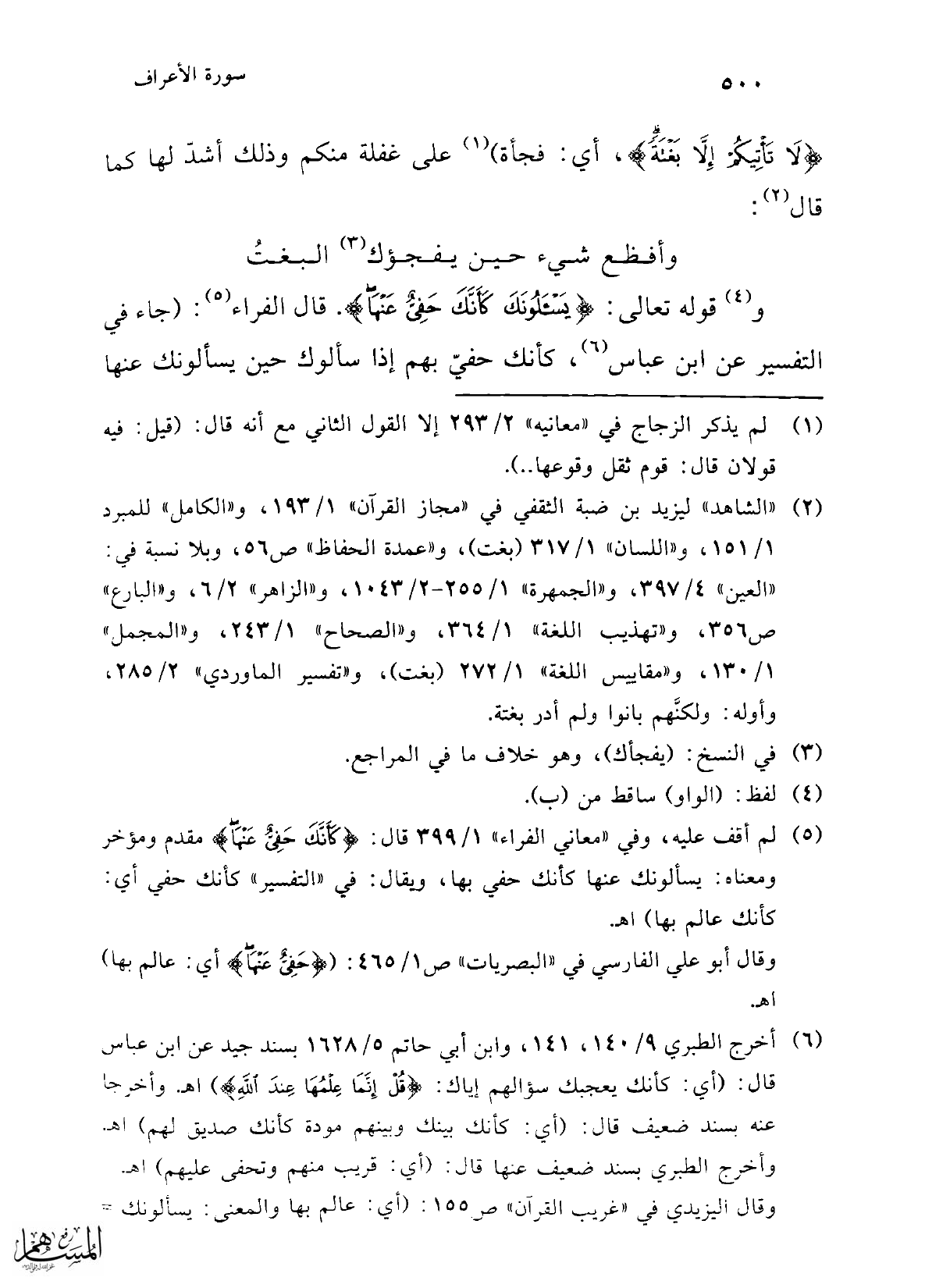 (¬5) لم أقف عليه، وفي "معاني الفراء" 1/ 399 قال: {كَأَنَّكَ حَفِيٌّ عَنْهَا} مقدم ومؤخر ومعناه: يسألونك عنها كأنك حفي بها، ويقال: في "التفسير" كأنك حفي أي: كأنك عالم بها) اهـ.