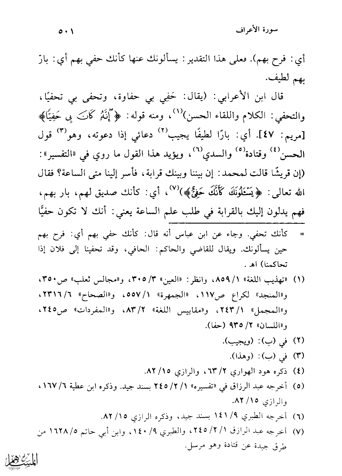 أي: فرح بهم). لعلى هذا التقدير: يسألونك عنها كأنك حفي بهم أي: بارّ بهم لطيف.