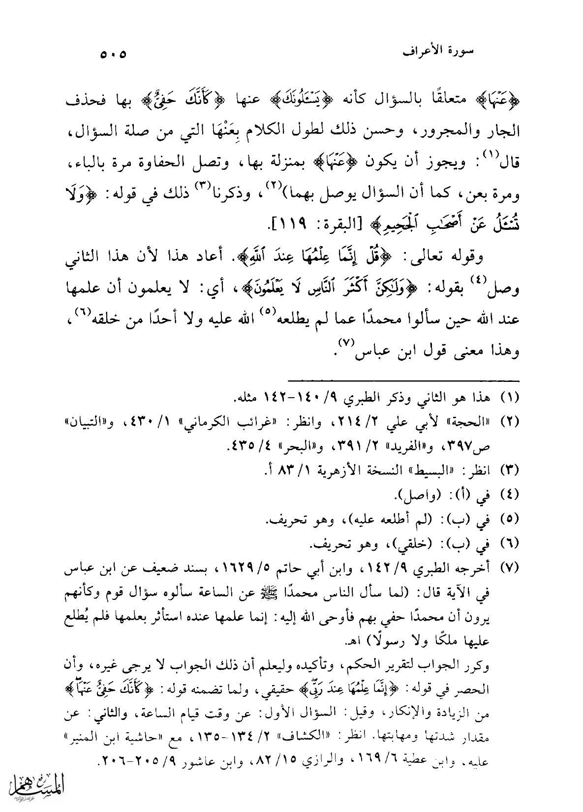 (¬7) أخرجه الطبري 9/ 142، وابن أبي حاتم 5/ 1629، بسند ضعيف عن ابن عباس في الآية قال: (لما سأل الناس محمدًا - صلى الله عليه وسلم - عن الساعة سألوه سؤال قوم وكأنهم يرون أن محمدًا حفي بهم فأوحى الله إليه: إنما علمها عنده استأثر بعلمها فلم يُطلع عليها ملكًا ولا رسولاً) اهـ.