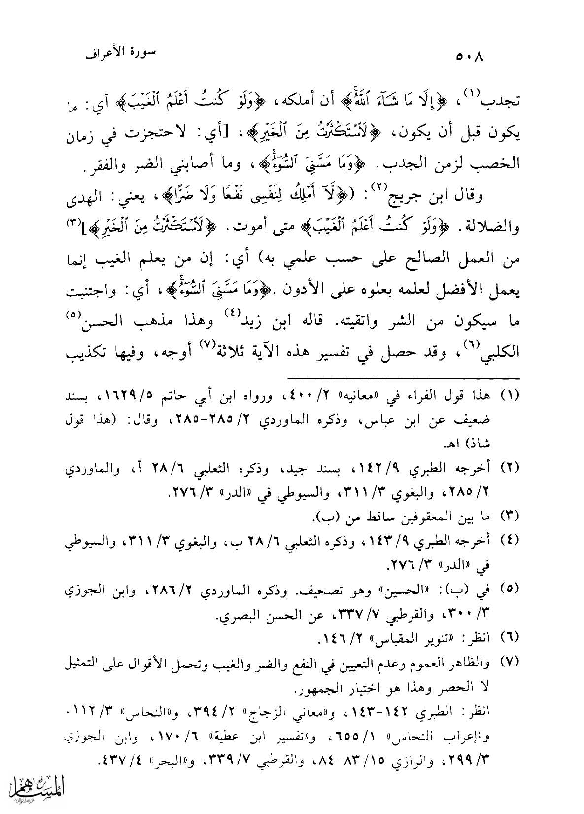وقال ابن جريج (¬2): ({لَا أَمْلِكُ لِنَفْسِي نَفْعًا وَلَا ضَرًّا}، يعني: الهدى والضلالة. {وَلَوْ كُنْتُ أَعْلَمُ الْغَيْبَ} متى أموت. {لَاسْتَكْثَرْتُ مِنَ الْخَيْرِ}] (¬3) من العمل الصالح على حسب علمي به) أي: إن من يعلم الغيب إنما يعمل الأفضل لعلمه بعلوه على الأدون. {وَمَا مَسَّنِيَ السُّوءُ}، أي: واجتنبت ما سيكون من الشر واتقيته. قاله ابن زيد (¬4) وهذا مذهب الحسن (¬5) الكلبي (¬6)، وقد حصل في تفسير هذه الآية ثلاثة (¬7) أوجه، وفيها تكذيب
