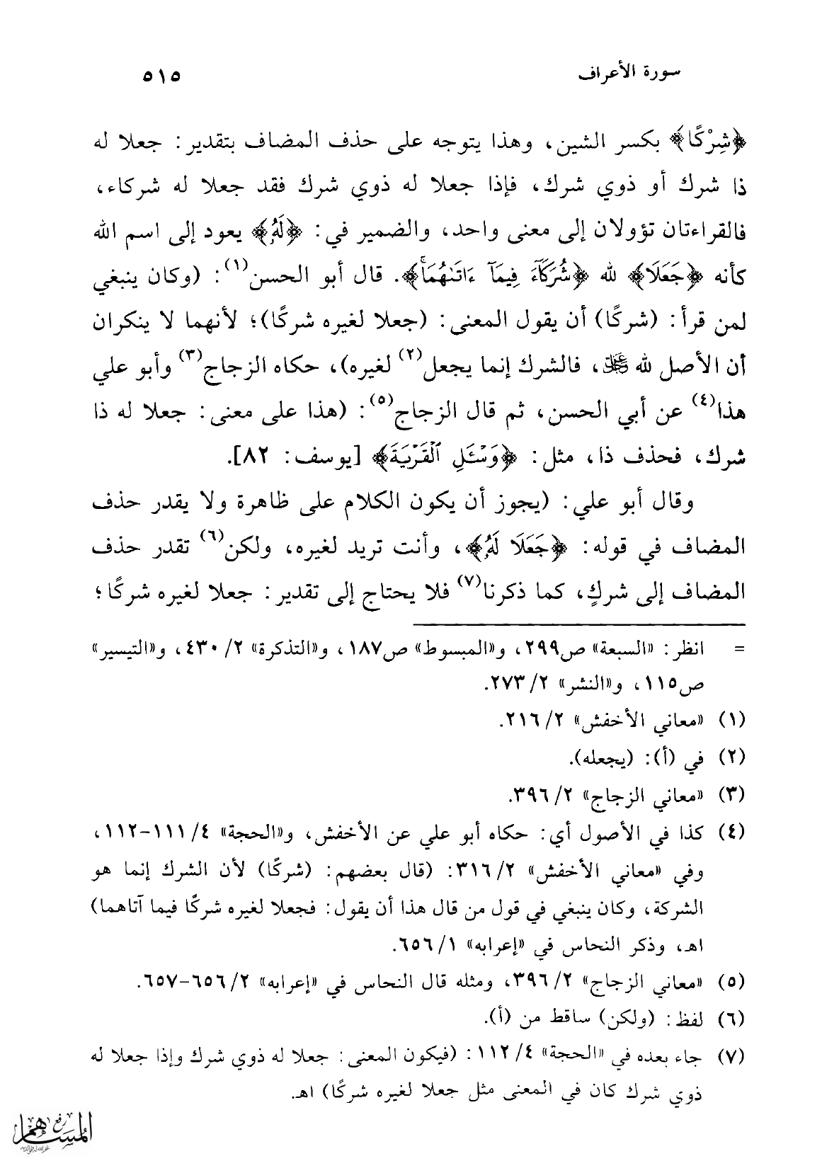 (¬7) جاء بعده في "الحجة" 4/ 112: (فيكون المعنى: جعلا له ذوي شرك وإذا جعلا له ذوي شرك وإن في المعنى مثل جعلا لغيره شركًا) اهـ.