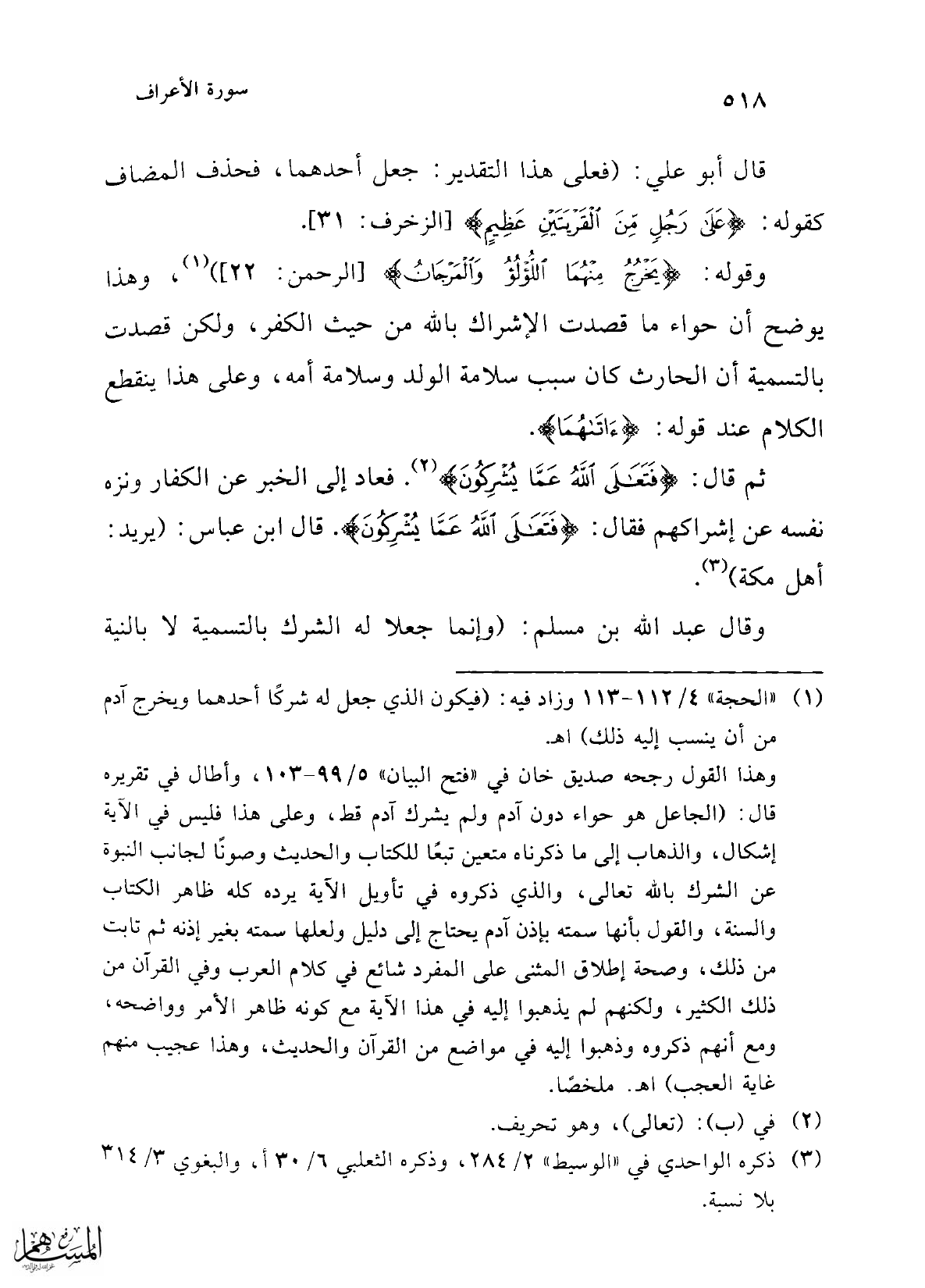 وقوله: {يَخْرُجُ مِنْهُمَا اللُّؤْلُؤُ وَالْمَرْجَانُ} [الرحمن: 22]) (¬1)، وهذا يوضح أن حواء ما قصدت الإشراك بالله من حيث الكفر، ولكن قصدت بالتسمية أن الحارث كان سبب سلامة الولد وسلامة أمه، وعلى هذا ينقطع الكلام عند قوله: {آتَاهُمَا}.