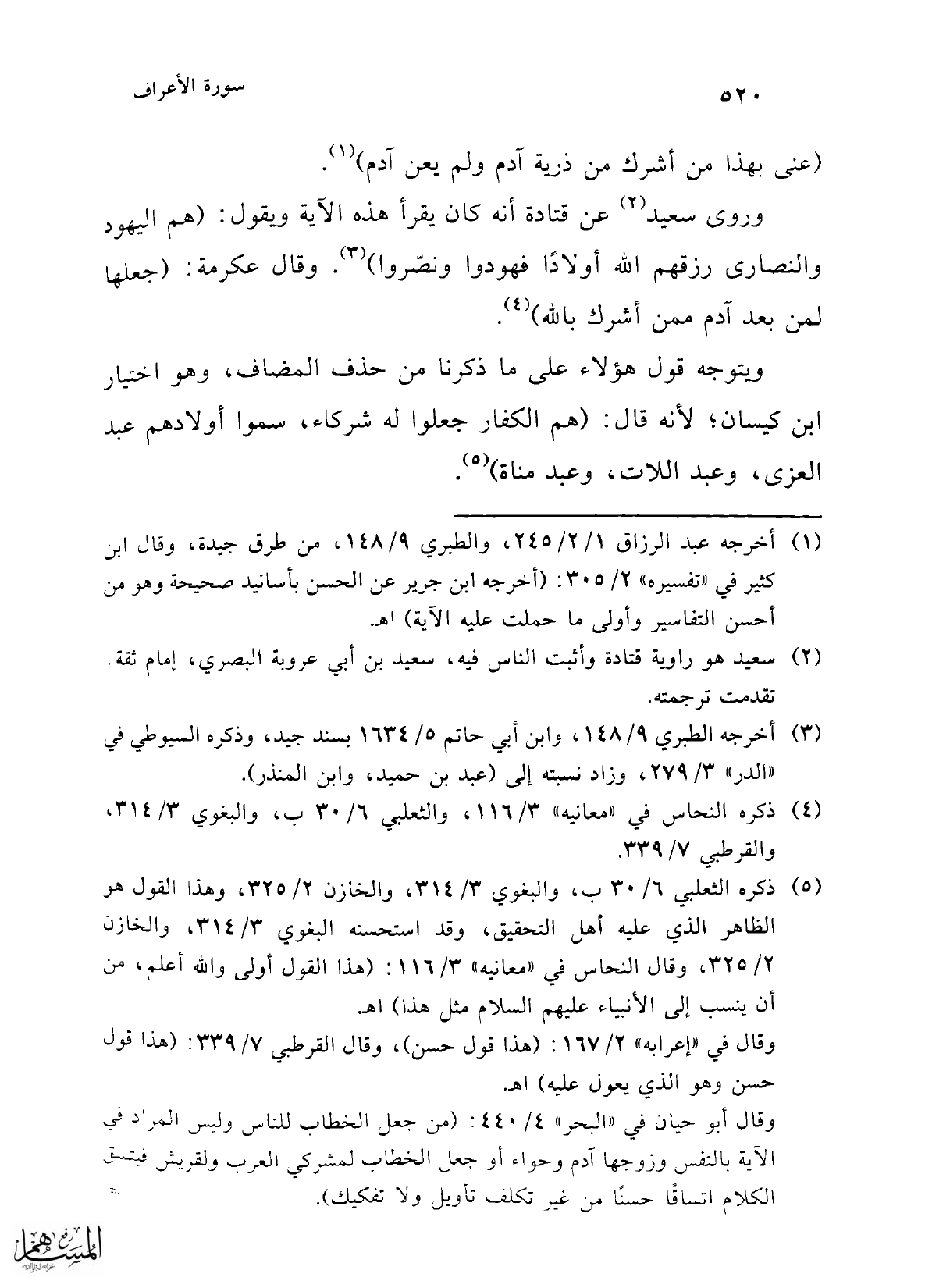 وروى سعيد (¬2) عن قتادة أنه كان يقول هذه الآية ويقول: (هم اليهود والنصارى رزقهم الله أولادًا فهودوا ونصّروا) (¬3). وقال عكرمة: (جعلها لمن بعد آدم ممن أشرك بالله) (¬4).