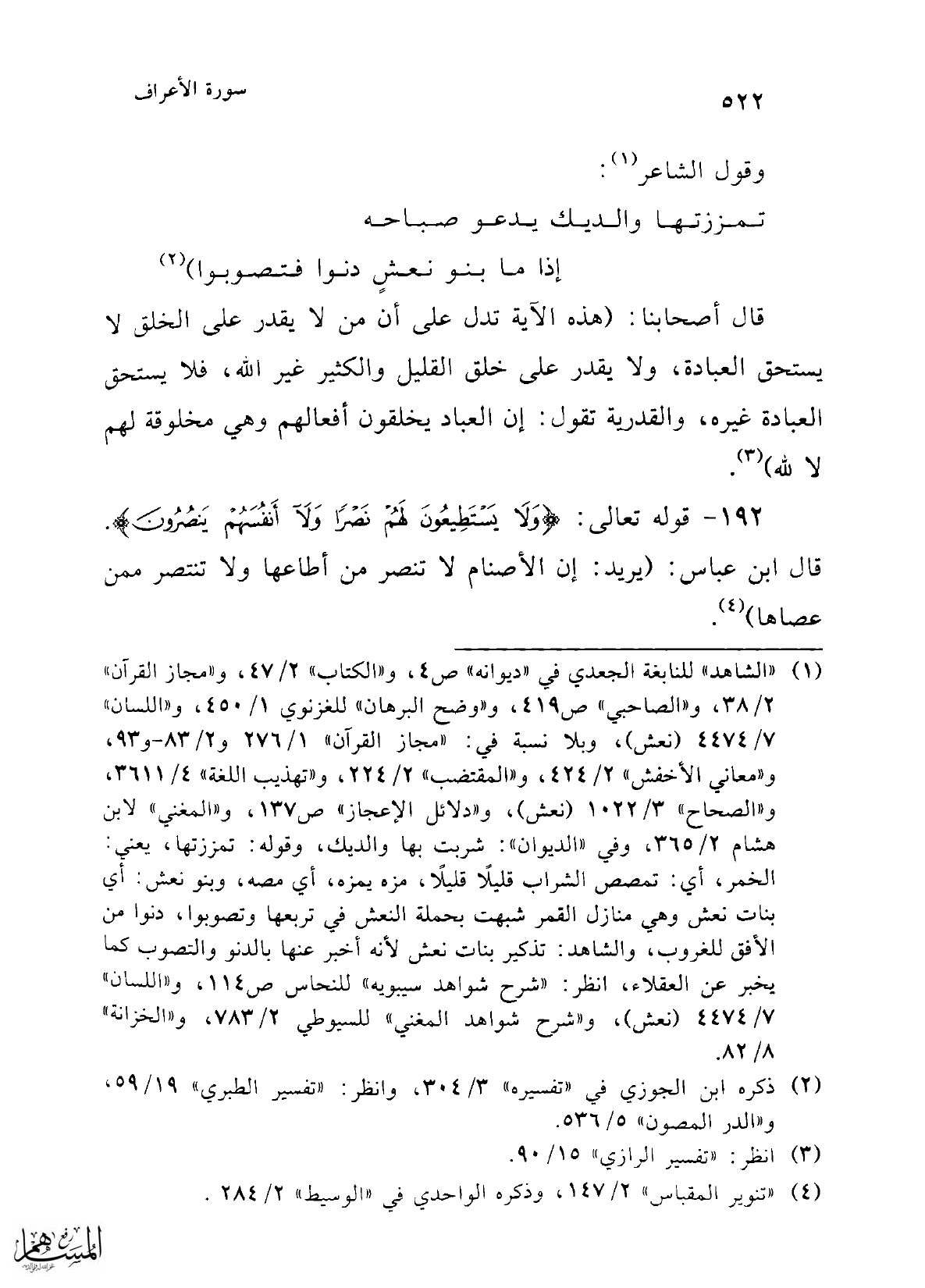 (¬1) "الشاهد" للنابغة الجعدي في "ديوانه" ص 4، و"الكتاب" 2/ 47، و"مجاز القرآن" 2/ 38، و"الصاحبي" ص 419، و"وضح البرهان" للغزنوي 1/ 450، و"اللسان" 7/ 4474 (نعش)، وبلا نسبة في: "مجاز القرآن" 1/ 276 و2/ 83 - و93، و"معاني الأخفش" 2/ 424، و"المقتضب" 2/ 224، و"تهذيب اللغة" 4/ 3611، و"الصحاح" 3/ 1022 (نعش)، و"دلائل الإعجاز" ص 137، و"المغني" لابن هشام 2/ 365، وفي "الديوان": شربت بها والديك، وقوله: تمززتها، يعني: الخمر، أي: تمصص الشراب قليلاً قليلاً، مزه يمزه، أي مصه، وبنو نعش: أي بنات نعش وهي منازل القمر شبهت بحملة النعش في تربعها وتصوبوا، دنوا من الأفق للغروب، والشاهد: تذكير بنات نعش لأنه أخبر عنها بالدنو والتصوب كما يخبر عن العقلاء، انظر: "شرح شواهد سيبويه" للنحاس ص 114، و"اللسان" 7/ 4474 (نعش)، و"شرح شواهد المغني" للسيوطي 2/ 783، و"الخزانة" 8/ 82.
