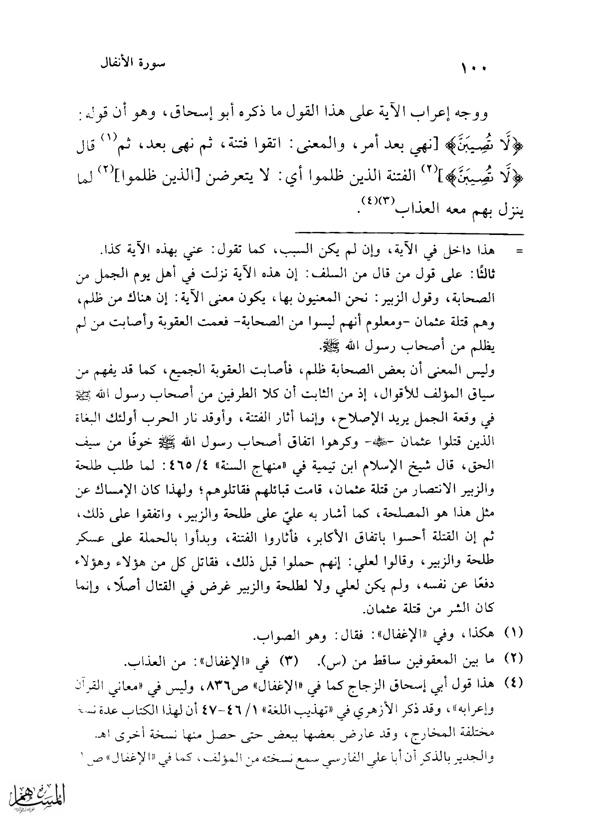 وليس المعنى أن بعض الصحابة ظلم، فأصابت العقوبة الجميع، كما قد يفهم من سياق المؤلف للأقوال، إذ من الثابت أن كلا الطرفين من أصحاب رسول الله - صلى الله عليه وسلم - في وقعة الجمل يريد الإصلاح، وإنما أثار الفتنة، وأوقد نار الحرب أولئك البغاة الذين قتلوا عثمان -رضي الله عنه- وكرهوا اتفاق أصحاب رسول الله - صلى الله عليه وسلم - خوفًا من سيف الحق، قال شيخ الإسلام ابن تيمية في "منهاج السنة" 4/ 465: لما طلب طلحة والزبير الانتصار من قتلة عثمان، قامت قبائلهم فقاتلوهم؛ ولهذا كان الإمساك عن مثل هذا هو المصلحة، كما أشار به على على طلحة والزبير، واتفقوا على ذلك، ثم إن القتلة أحسوا باتفاق الأكابر، فأثاروا الفتنة، وبدأوا بالحملة على عسكر طلحة والزبير، وقالوا لعلي: إنهم حملوا قبل ذلك، فقاتل كل من هؤلاء وهؤلاء دفعًا عن نفسه، ولم يكن لعلي ولا لطلحة والزبير غرض في القتال أصلاً، وإنما كان الشر من قتلة عثمان.