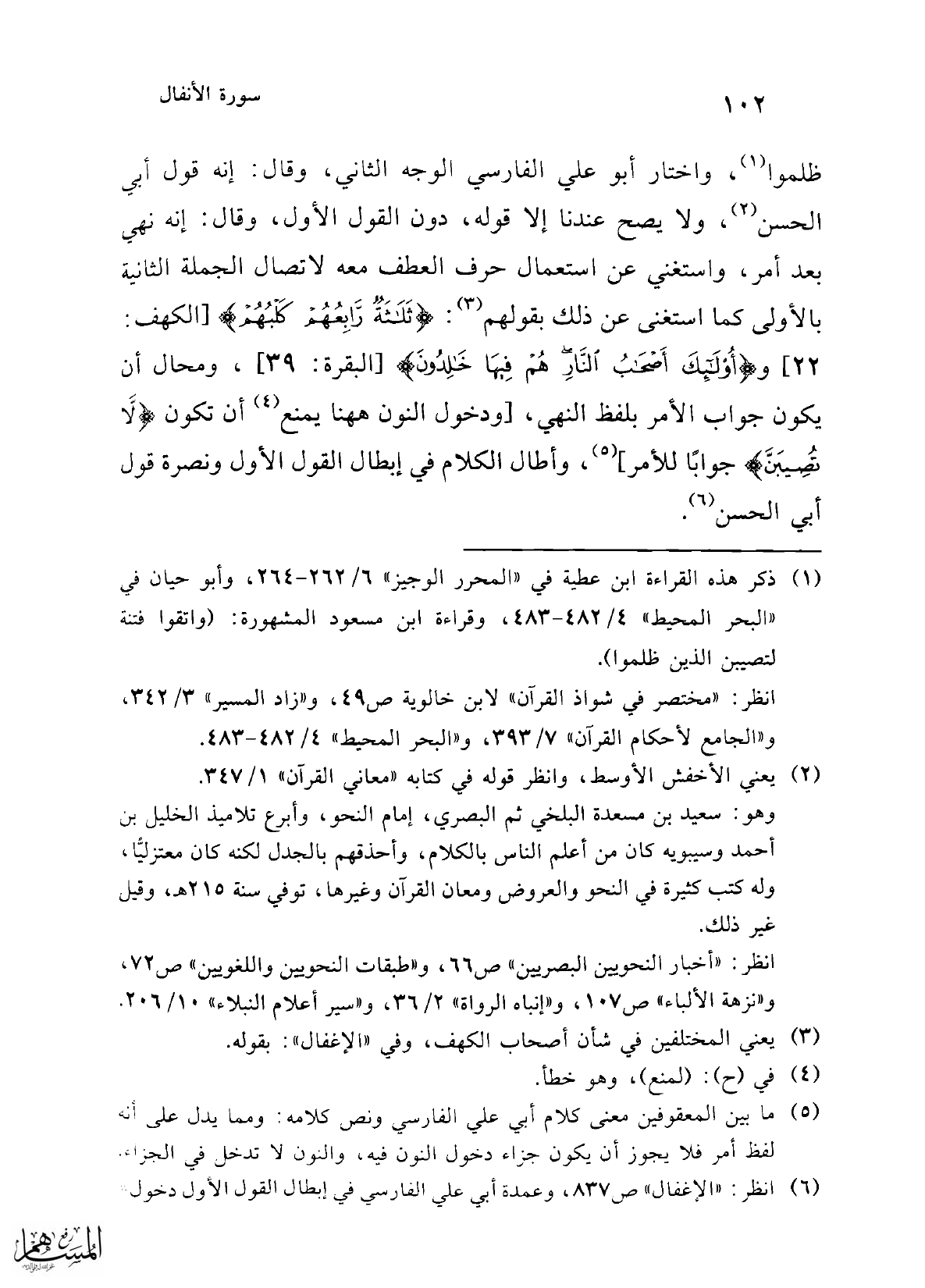 ظلموا (¬1)، واختار أبو علي الفارسي الوجه الثاني، وقال: إنه قول أبي الحسن (¬2)، ولا يصح عندنا إلا قوله، دون القول الأول، وقال: إنه نهي بعد أمر، واستغني عن استعمال حرف العطف معه لاتصال الجملة الثانية بالأولى كما استغنى عن ذلك بقولهم (¬3): {ثَلَاثَةٌ رَابِعُهُمْ كَلْبُهُمْ} [الكهف: 22]، و {أُولَئِكَ أَصْحَابُ النَّارِ هُمْ فِيهَا خَالِدُونَ} [البقرة: 39]، ومحال أن يكون جواب الأمر بلفظ النهي، [ودخول النون هاهنا يمنع (¬4) أن تكون {لَا تُصِيبَنَّ} جوابًا للأمر] (¬5)، وأطال الكلام في إبطال القول الأول ونصرة قول أبي الحسن (¬6).