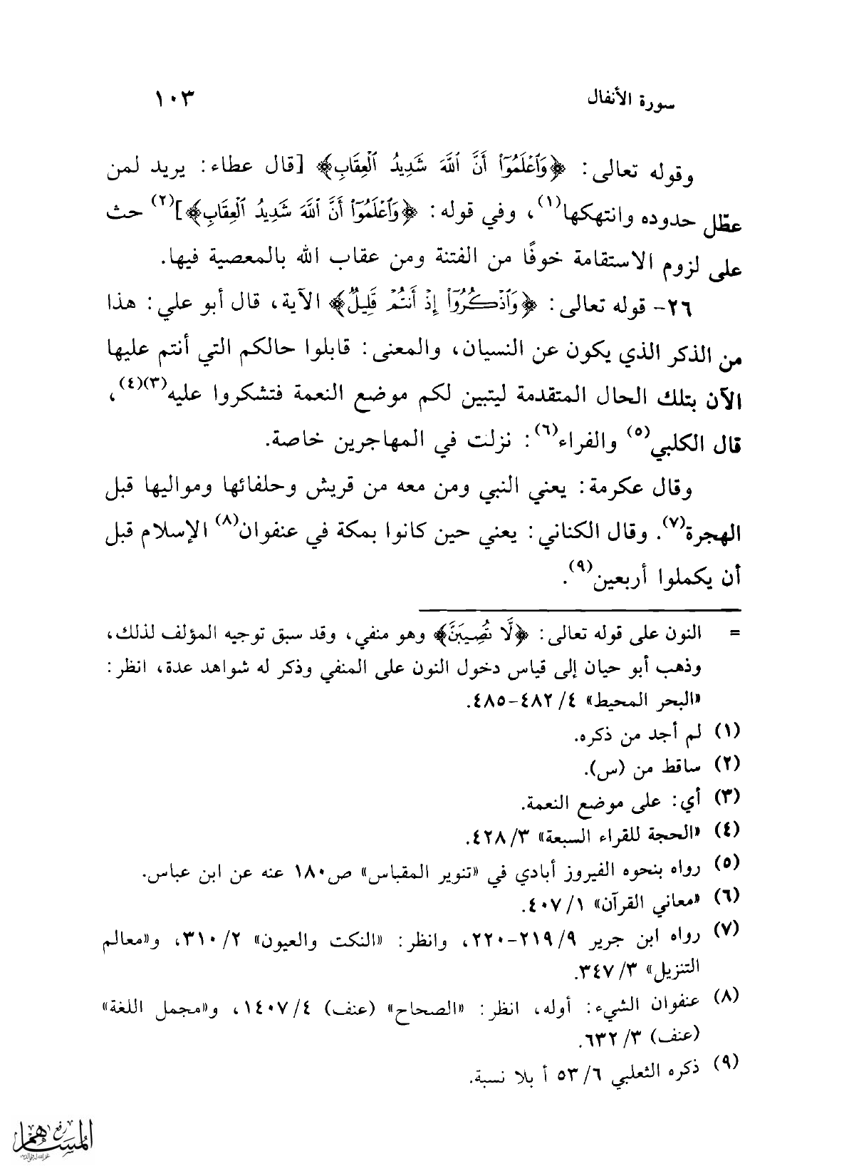 وقوله تعالى: {وَاعْلَمُوا أَنَّ اللَّهَ شَدِيدُ الْعِقَابِ} [قال عطاء: يريد لمن عطّل حدوده وانتهكها (¬1)، وفي قوله: {وَاعْلَمُوا أَنَّ اللَّهَ شَدِيدُ الْعِقَابِ}] (¬2) حث على لزوم الاستقامة خوفًا من الفتنة ومن عقاب الله بالمعصية فيها.