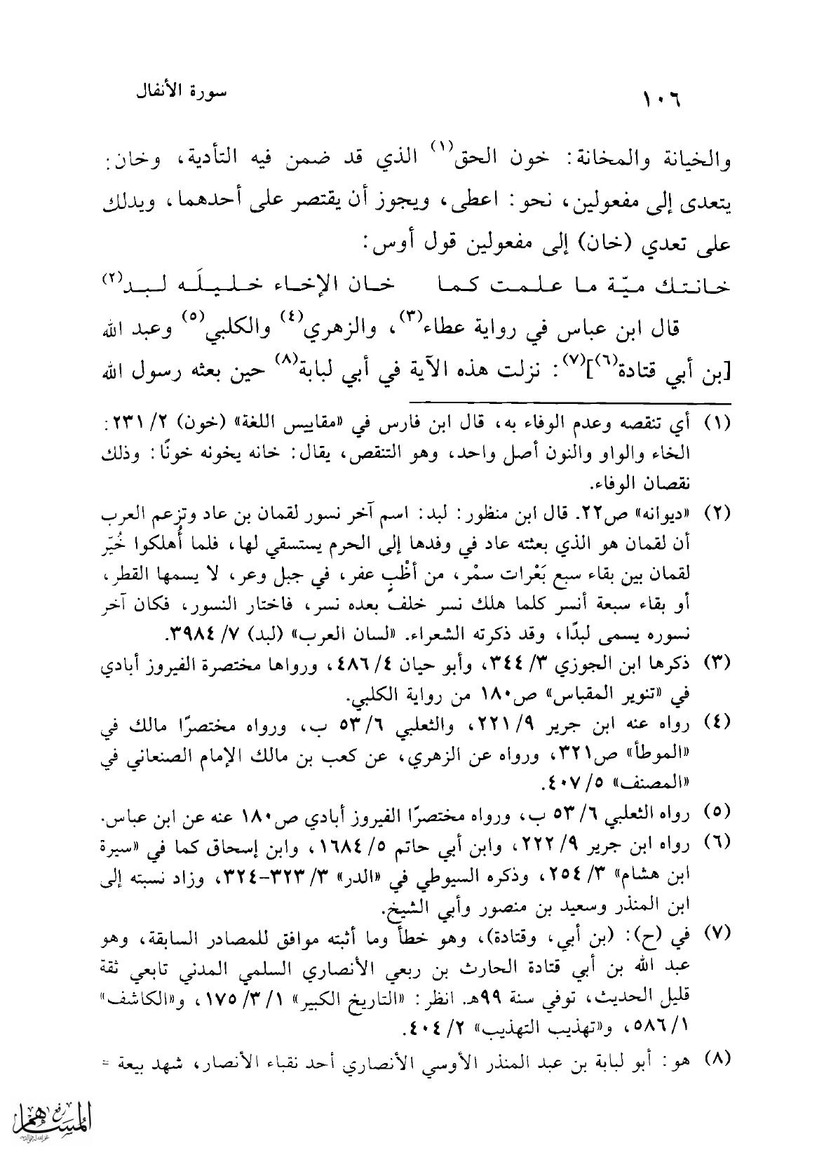 (¬8) هو: أبو لبابة بن عبد المنذر الأوسي الأنصاري أحد نقباء الأنصار، شهد بيعة =