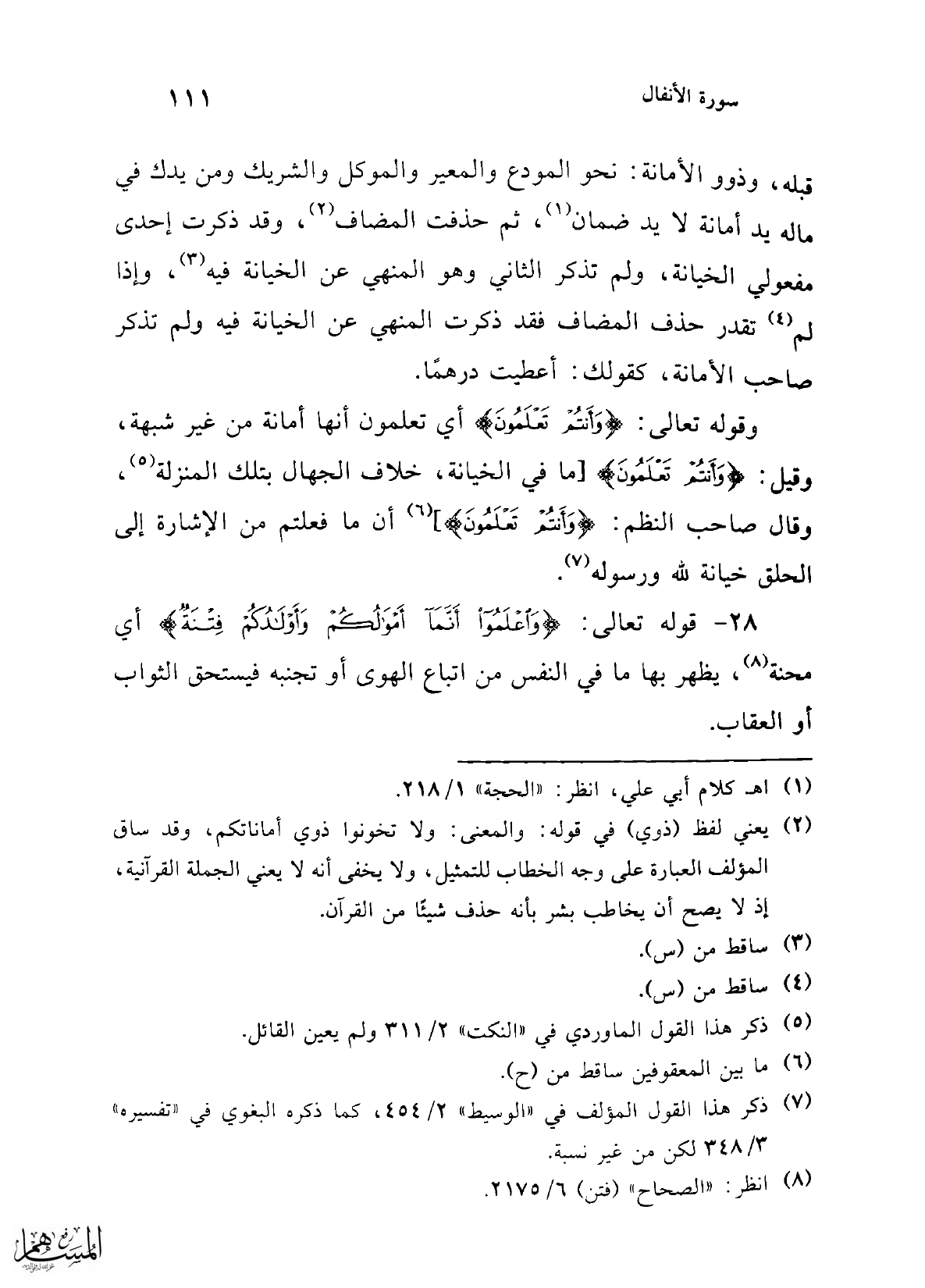 (¬2) يعني لفظ (ذوي) في قوله: والمعنى: ولا تخونوا ذوي أماناتكم، وقد ساق المؤلف العبارة على وجه الخطاب للتمثيل، ولا يخفى أنه لا يعني الجملة القرآنية، إذ لا يصح أن يخاطب بشر بأنه حذف شيئًا من القرآن.