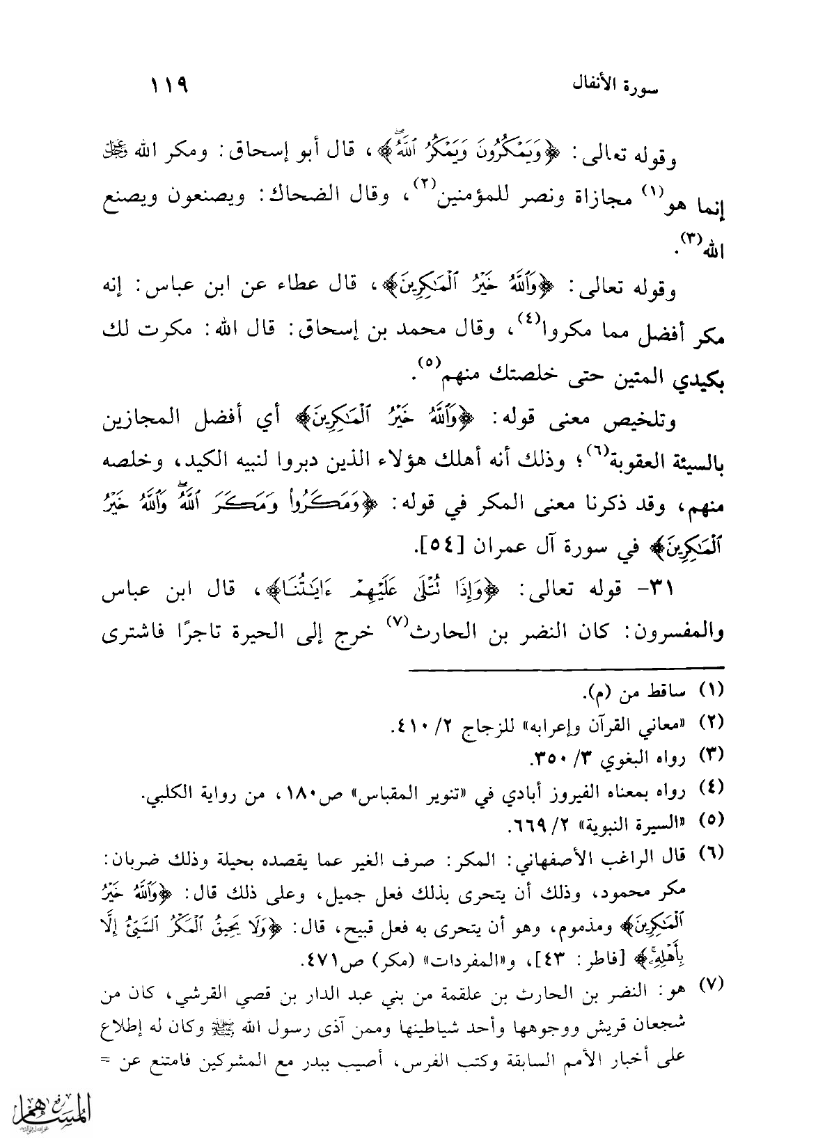 (¬7) هو: النضر بن الحارث بن علقمة من بني عبد الدار بن قصي القرشي، كان من شجعان قريش ووجوهها واحد شياطينها وممن آذى رسول الله - صلى الله عليه وسلم - وكان له إطلاع على أخبار الأمم السابقة وكتب الفرس، أصيب ببدر مع المشركين فامتنع عن =