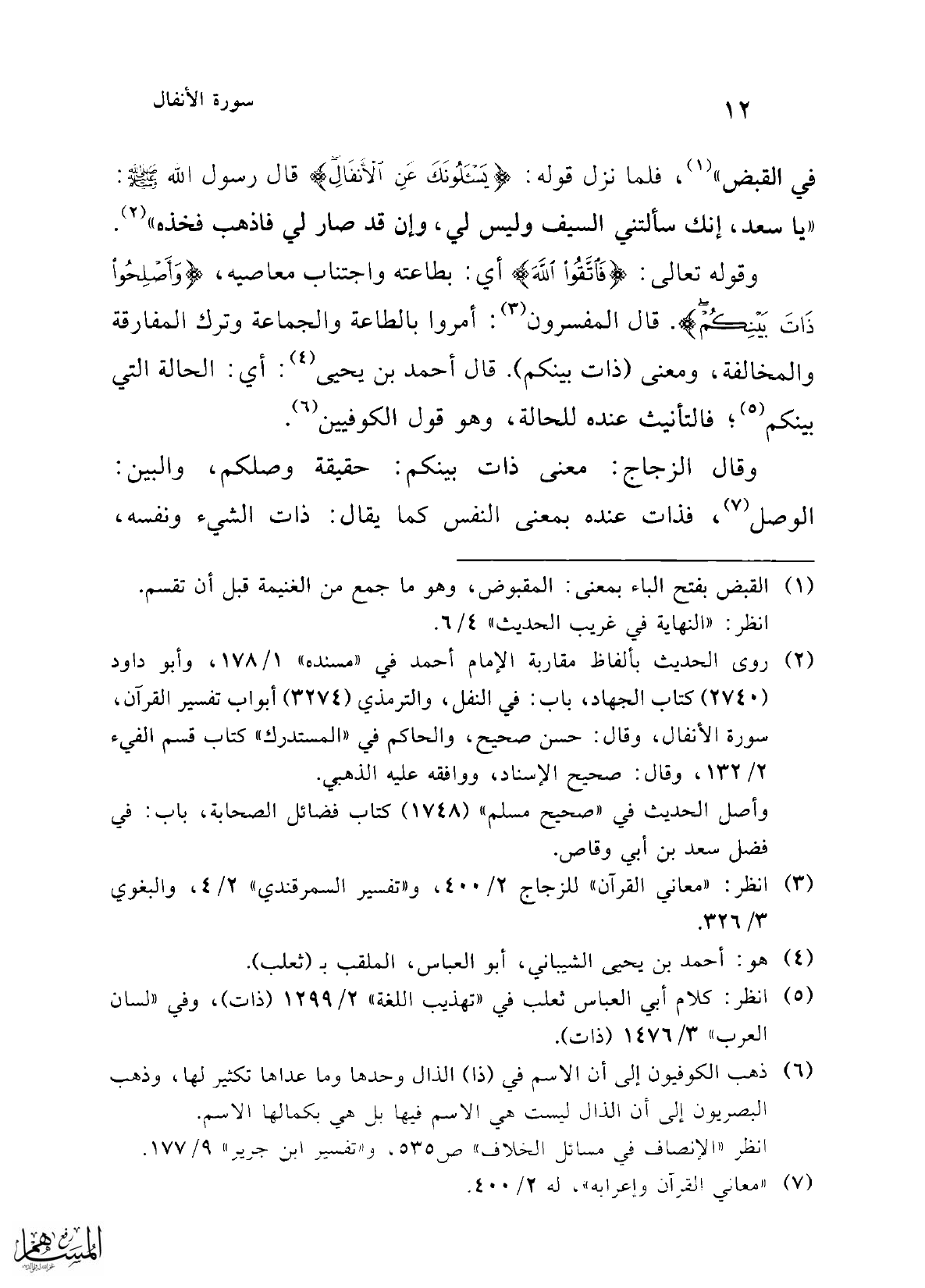 في القبض" (¬1)، فلما نزل قوله: {يَسْأَلُونَكَ عَنِ الْأَنْفَالِ} قال رسول الله - صلى الله عليه وسلم -: "يا سعد، إنك سألتني السيف وليس لي، وإن قد صار لي فاذهب فخذه" (¬2).