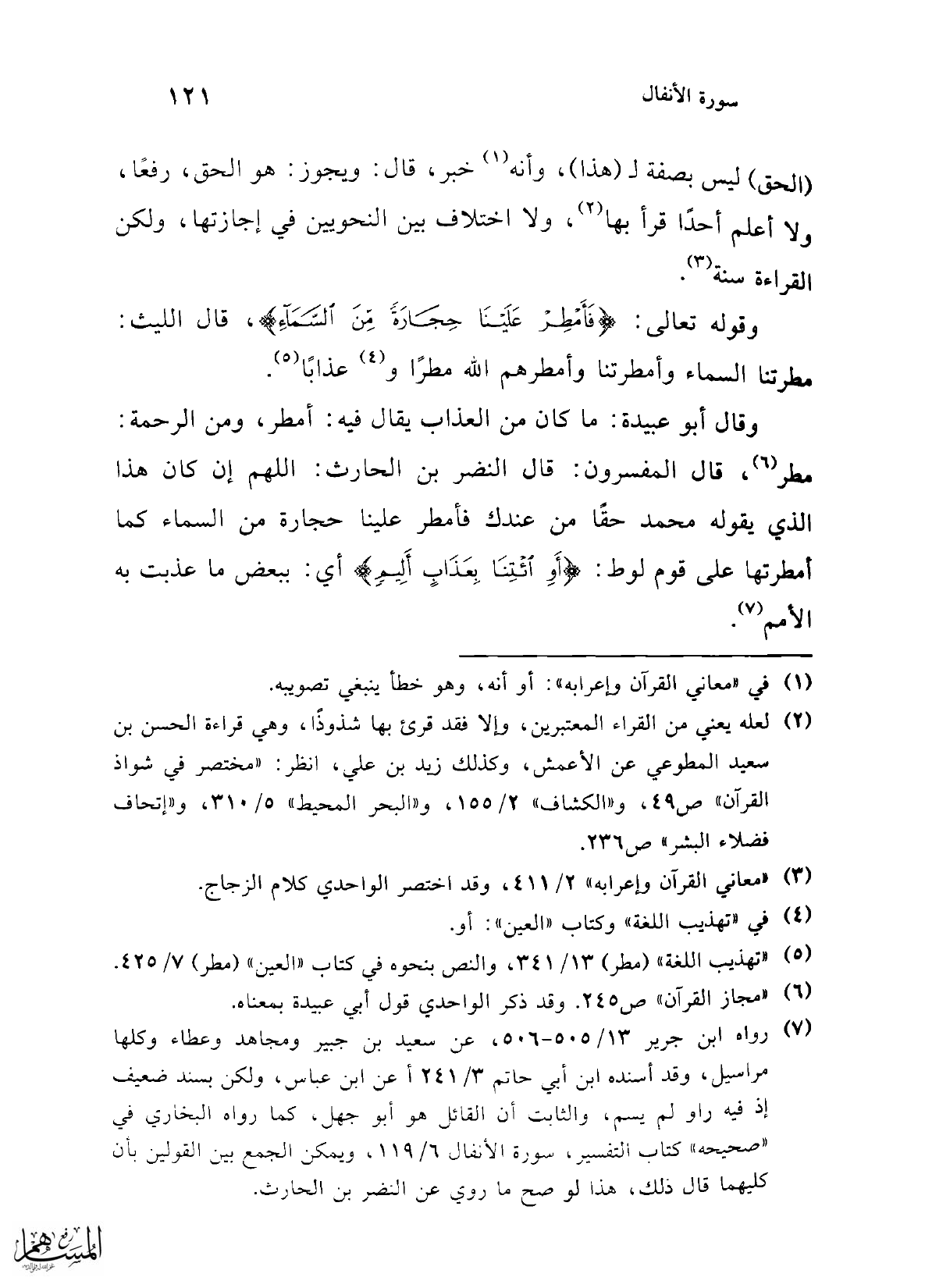 (¬7) رواه ابن جرير 13/ 505 - 506، عن سعيد بن جبير ومجاهد عطاء وكلها مراسيل، وقد أسنده ابن أبي حاتم 3/ 241 أعن ابن عباس، ولكن بسند ضعيف إذ فيه راو لم يسم، والثابت أن القائل هو أبو جهل، كما رواه البخاري في "صحيحه" كتاب التفسير، سورة الأنفال 6/ 119، ويمكن الجمع بين القولين بأن كليهما قال ذلك، هذا لو صح ما روي عن النضر بن الحارث.