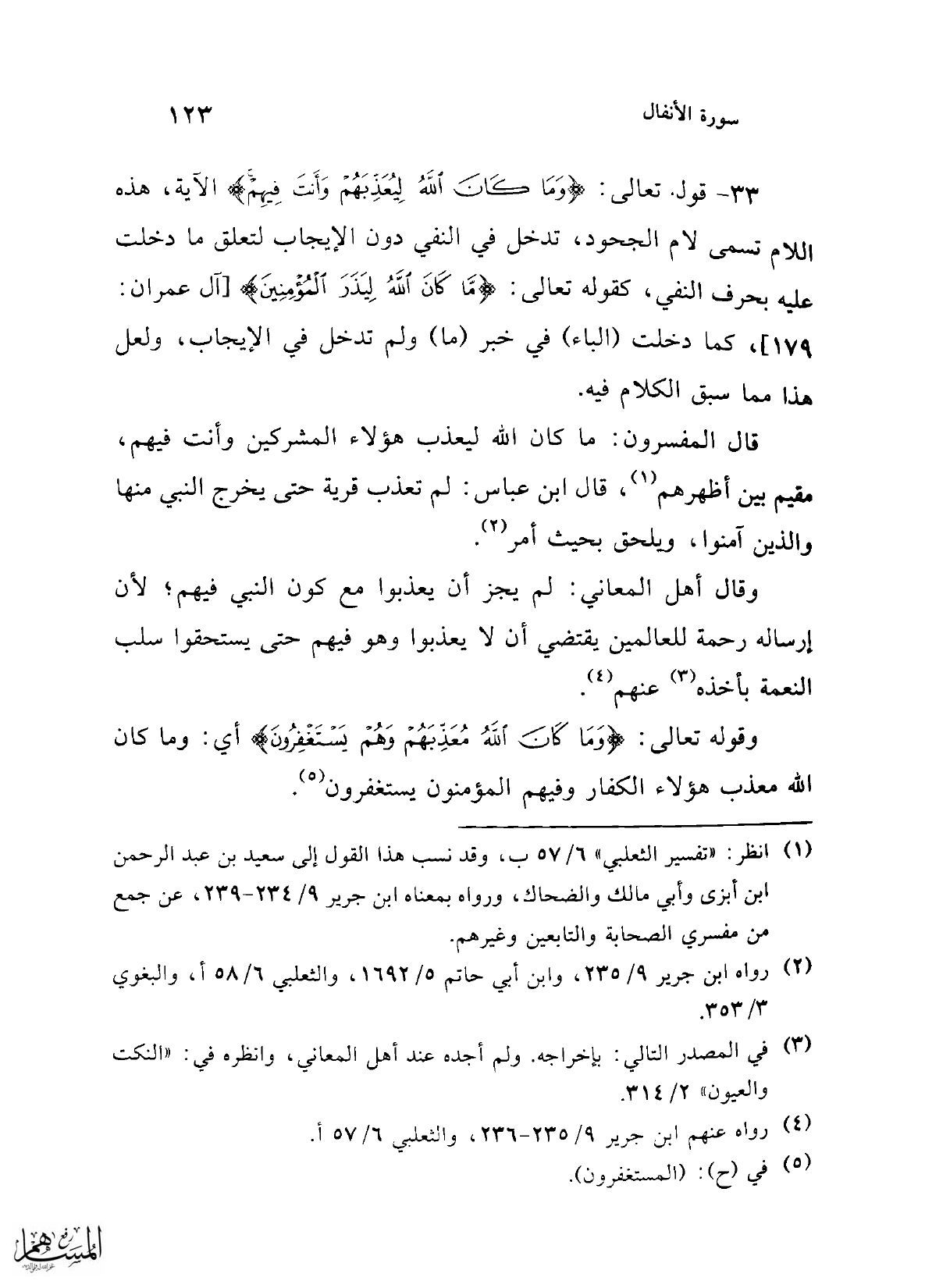33 - قوله تعالى: {وَمَا كَانَ اللَّهُ لِيُعَذِّبَهُمْ وَأَنْتَ فِيهِمْ} الآية، هذه اللام تسمى لام الجحود، تدخل في النفي دون الإيجاب لتعلق ما دخلت عليه بحرف النفي، كقوله تعالى: {مَا كَانَ اللَّهُ لِيَذَرَ الْمُؤْمِنِينَ} [آل عمران: 179]، كما دخلت (الباء) في خبر (ما) ولم تدخل في الإيجاب، ولعل هذا مما سبق الكلام فيه.