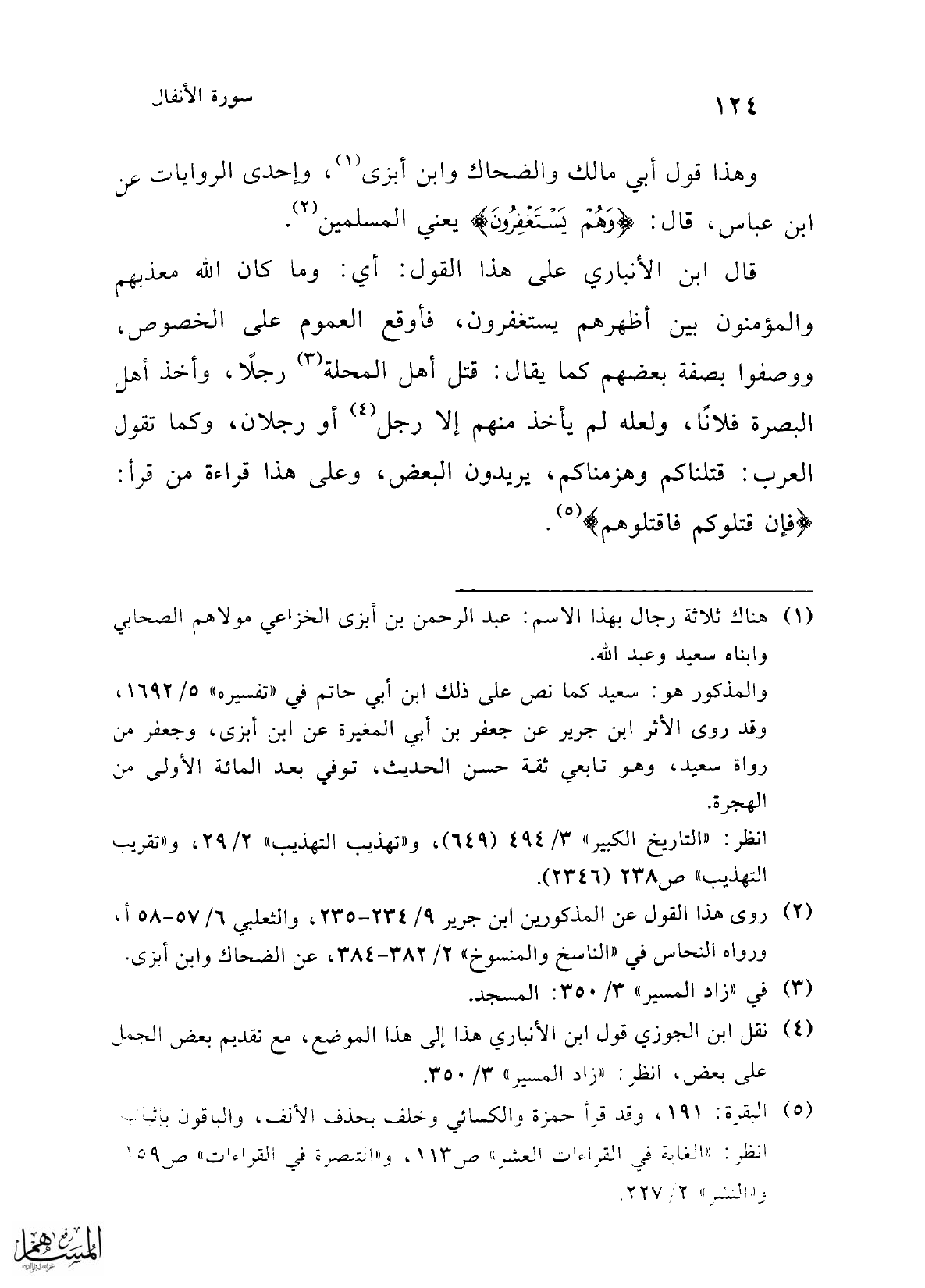 قال ابن الأنباري على هذا القول: أي: وما كان الله معذبهم والمؤمنون بين أظهرهم يستغفرون، فأوقع العموم على الخصوص، ووصفوا بصفة بعضهم كما يقال: قتل أهل المحلة (¬3) رجلاً، وأخذ أهل البصرة فلانًا , ولعله لم يأخذ منهم إلا رجل (¬4) أو رجلان، وكما تقول العرب: قتلناكم وهزمناكم، يريدون البعض، وعلى هذا قراءة من قرأ: {فإن قتلوكم فاقتلوهم} (¬5).