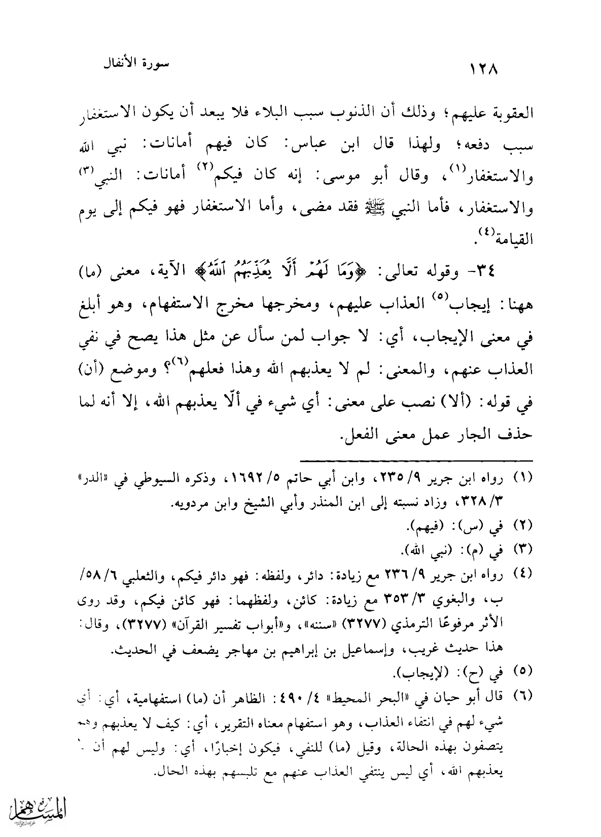العقوبة عليهم؛ وذلك أن الذنوب سبب البلاء فلا يبعد أن يكون الاستغفار سبب دفعه؛ ولهذا قال ابن عباس: كان فيهم أمانات: نبي الله والاستغفار (¬1)، وقال أبو موسى: إنه كان فيكم (¬2) أمانات: النبي (¬3) والاستغفار، فأما النبي - صلى الله عليه وسلم - فقد مضى، وأما الاستغفار فهو فيكم إلى يوم القيامة (¬4).