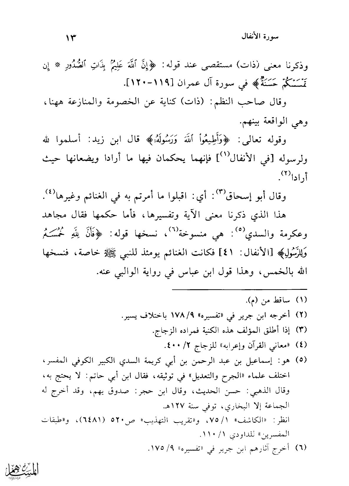 (¬5) هو: إسماعيل بن عبد الرحمن بن أبي كريمة السدي الكبير الكوفي المفسر، اختلف علماء "الجرح والعديل" في توثيقه، فقال ابن أبي حاتم: لا يحتج به، وقال الذهبي: حسن الحديث، وقال ابن حجر: صدوق يهم، وقد أخرج له الجماعة إلا البخاري، توفي سنة 127 هـ.