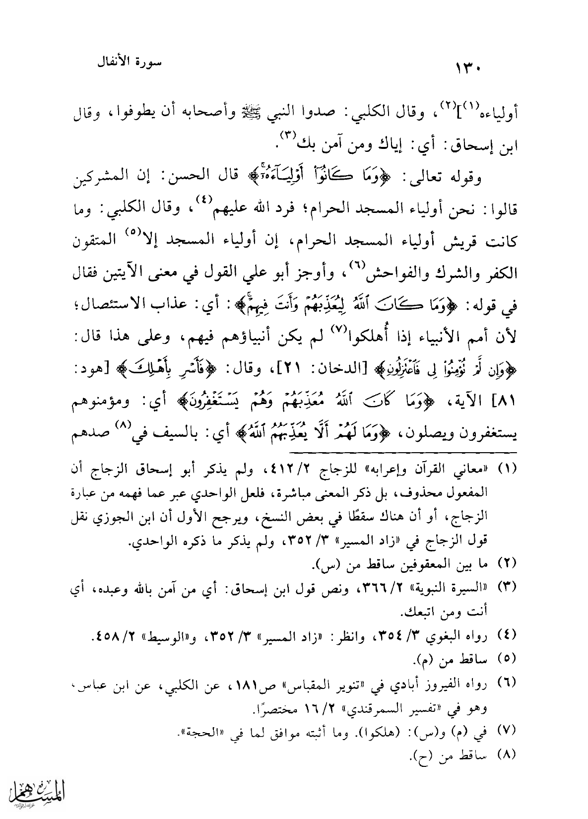وقوله تعالى: {وَمَا كَانُوا أَوْلِيَاءَهُ} قال الحسن: إن المشركين قالوا: نحن أولياء المسجد الحرام؛ فرد الله عليهم (¬4)، وقال الكلبي: وما كانت قريش أولياء المسجد الحرام، إن أولياء المسجد إلا (¬5) المتقون الكفر والشرك والفواحش (¬6)، وأوجز أبو علي القول في معنى الآيتين فقال في قوله: {وَمَا كَانَ اللَّهُ لِيُعَذِّبَهُمْ وَأَنْتَ فِيهِمْ}: أي: عذاب الاستئصال؛ لأن أمم الأنبياء إذا أُهلكوا (¬7) لم يكن أنبياؤهم فيهم، وعلى هذا قال: {وَإِنْ لَمْ تُؤْمِنُوا لِي فَاعْتَزِلُونِ} [الدخان: 21]، وقال: {فَأَسْرِ بِأَهْلِكَ} [هود: 81]، الآية، {وَمَا كَانَ اللَّهُ مُعَذِّبَهُمْ وَهُمْ يَسْتَغْفِرُونَ} أي: ومؤمنوهم يستغفرون ويصلون، {وَمَا لَهُمْ أَلَّا يُعَذِّبَهُمُ اللَّهُ} أي: بالسيف في (¬8) صدهم