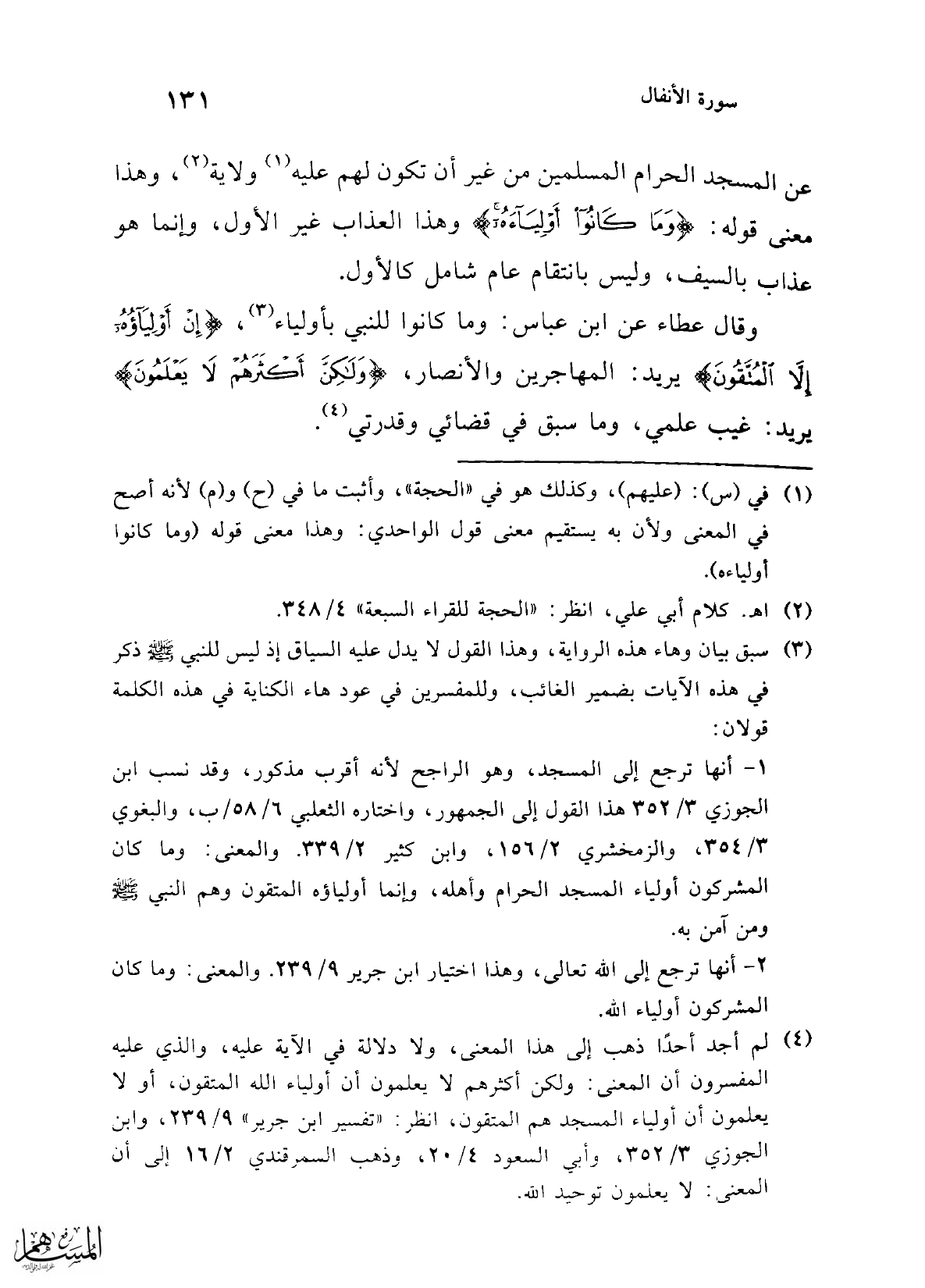 1 - أنها ترجع إلى المسجد، وهو الراجح لأنه أقرب مذكور، وقد نسب ابن الجوزي 3/ 352 هذا القول إلى الجمهور، واختاره الثعلبي 6/ 58/ ب، والبغوي 3/ 354، والزمخشري 2/ 156، وابن كثير 2/ 339. والمعنى: وما كان المشركون أولياء المسجد الحرام وأهله، وإنما أولياؤه المتقون وهم النبي - صلى الله عليه وسلم - ومن آمن به.
