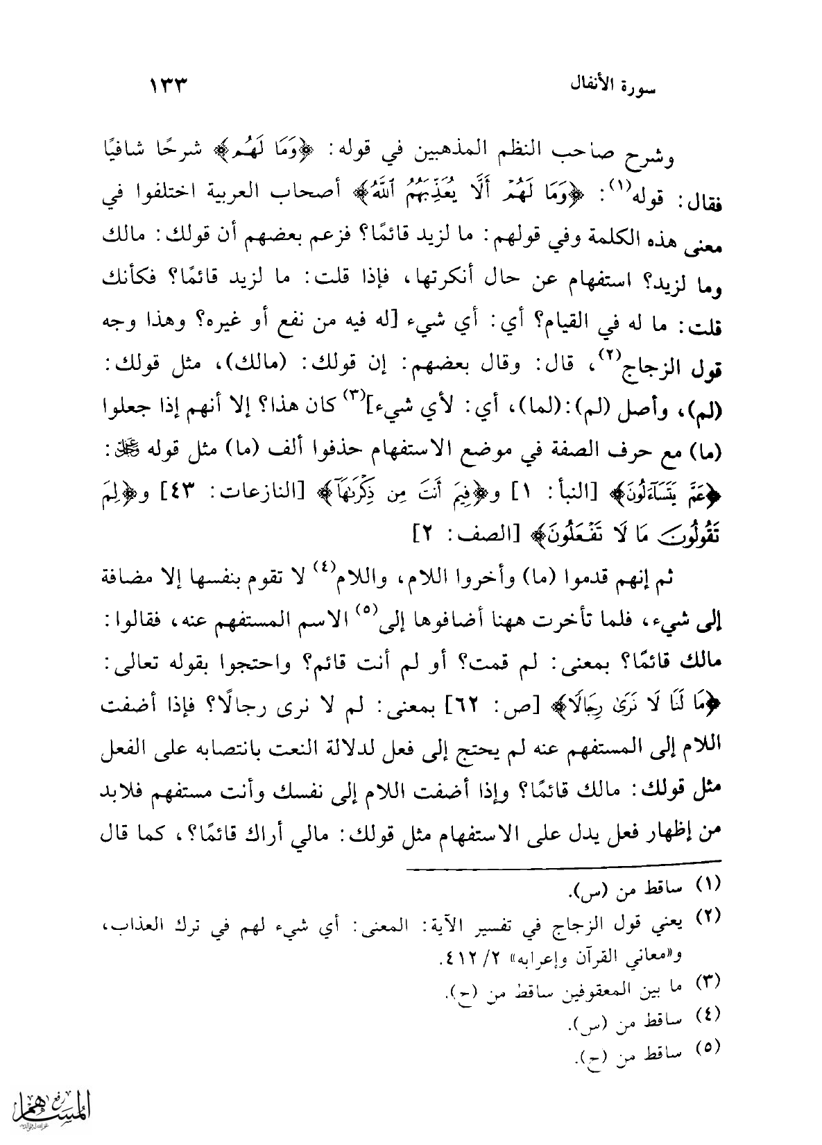وشرح صاحب النظم المذهبين في قوله: {وَمَا لَهُمْ} شرحًا شافيًا فقال: قوله (¬1): {وَمَا لَهُمْ أَلَّا يُعَذِّبَهُمُ اللَّهُ} أصحاب العربية اختلفوا في معنى هذه الكلمة وفي قولهم: ما لزيد قائمًا؟ فزعم بعضهم أن قولك: مالك وما لزيد؟ استفهام عن حال أنكرتها، فإذا قلت: ما لزيد قائمًا؟ فكأنك قلت: ما له في القيام؟ أي: أي شيء [له فيه من نفع أو غيره؟ وهذا وجه قول الزجاج (¬2)، قال: وقال بعضهم: إن قولك: (مالك)، مثل قولك: (لم)، وأصل (لم): (لما)، أي: لأي شيء] (¬3) كان هذا؟ إلا أنهم إذا جعلوا (ما) مع حرف الصفة في موضع الاستفهام حذفوا ألف (ما) مثل قوله عز وجل: {عَمَّ يَتَسَاءَلُونَ} [النبأ: 1]، و {فِيمَ أَنْتَ مِنْ ذِكْرَاهَا} [النازعات: 43]، و {لِمَ تَقُولُونَ مَا لَا تَفْعَلُونَ} [الصف: 2].