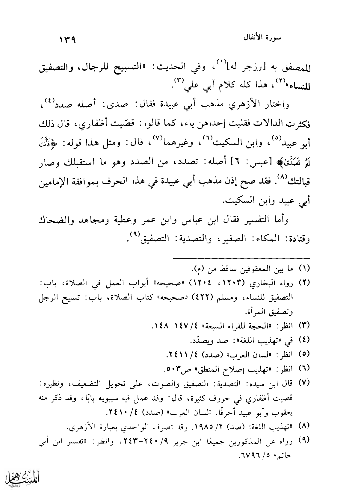 واختار الأزهري مذهب أبي عبيدة فقال: صدى: أصله صدد (¬4)، فكثرت الدالات فقلبت إحداهن ياء، كما قالوا: قصّيت أظفاري، قال ذلك أبو عبيد (¬5)، وابن السكيت (¬6)، وغيرهما (¬7)، قال: ومثل هذا قوله: {فَأَنْتَ لَهُ تَصَدَّى} [عبس: 6] أصله: تصدد، من الصدد وهو ما استقبلك وصار قبالتك (¬8). فقد صح إذن مذهب أبي عبيدة في هذا الحرف بموافقة الإمامين أبي عبيد وابن السكيت.