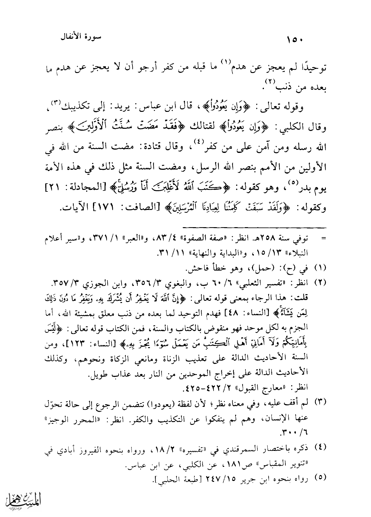 (¬2) انظر: "تفسير الثعلبي" 6/ 60 ب، والبغوي 3/ 356، وابن الجوزي 3/ 357. قلت: هذا الرجاء بمعنى قوله تعالى: {إِنَّ اللَّهَ لَا يَغْفِرُ أَنْ يُشْرَكَ بِهِ وَيَغْفِرُ مَا دُونَ ذَلِكَ لِمَنْ يَشَاءُ} [النساء: 48] فهدم التوحيد لما بعده من ذنب معلق بمشيئة الله، أما الجزم به لكل موحد فهو منقوض بالكتاب والسنة، فمن الكتاب قوله تعالى: {لَيْسَ بِأَمَانِيِّكُمْ وَلَا أَمَانِيِّ أَهْلِ الْكِتَابِ مَنْ يَعْمَلْ سُوءًا يُجْزَ بِهِ} [النساء: 123]، ومن السنة الأحاديث الدالة على تعذيب الزناة ومانعي الزكاة ونحوهم، وكذلك الأحاديث الدالة على إخراج الموحدين من النار بعد عذاب طويل.
