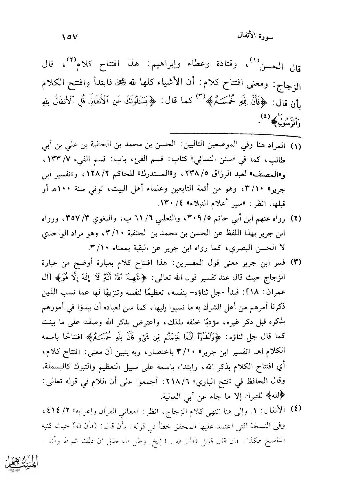 (¬1) المراد هنا وفي الموضعين التاليين: الحسن بن محمد بن الحنفية بن علي بن أبي طالب، كما في "سنن النسائي" كتاب: قسم الفئ، باب: قسم الفيء 7/ 133، و"المصنف" لعبد الرزاق 5/ 238، و"المستدرك" للحاكم 2/ 128، و "تفسير ابن جرير" 10/ 3، وهو من أئمة التابعين وعلماء أهل البيت، توفي سنة 100هـ أو قبلها. انظر: "سير أعلام النبلاء" 4/ 130.