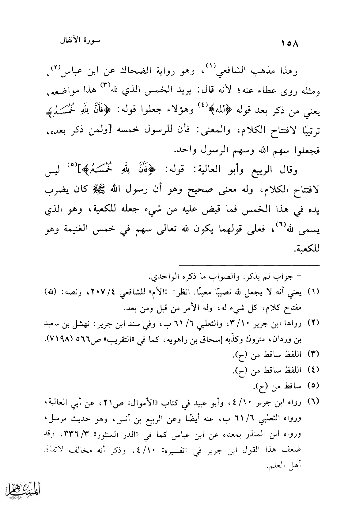 (¬6) رواه ابن جرير 10/ 4، وأبو عبيد في كتاب "الأموال" ص 21، عن أبي العالية، ورواه الثعلبي 6/ 61 ب، عنه أيضًا وعن الربيع بن أنس، وهو حديث مرسل, ورواه ابن المنذر بمعناه عن ابن عباس كما في "الدر المنثور" 3/ 336، وقد ضعف هذا القول ابن جرير في "تفسيره" 10/ 4، وذكر أنه مخالف لاتفاق أهل العلم.