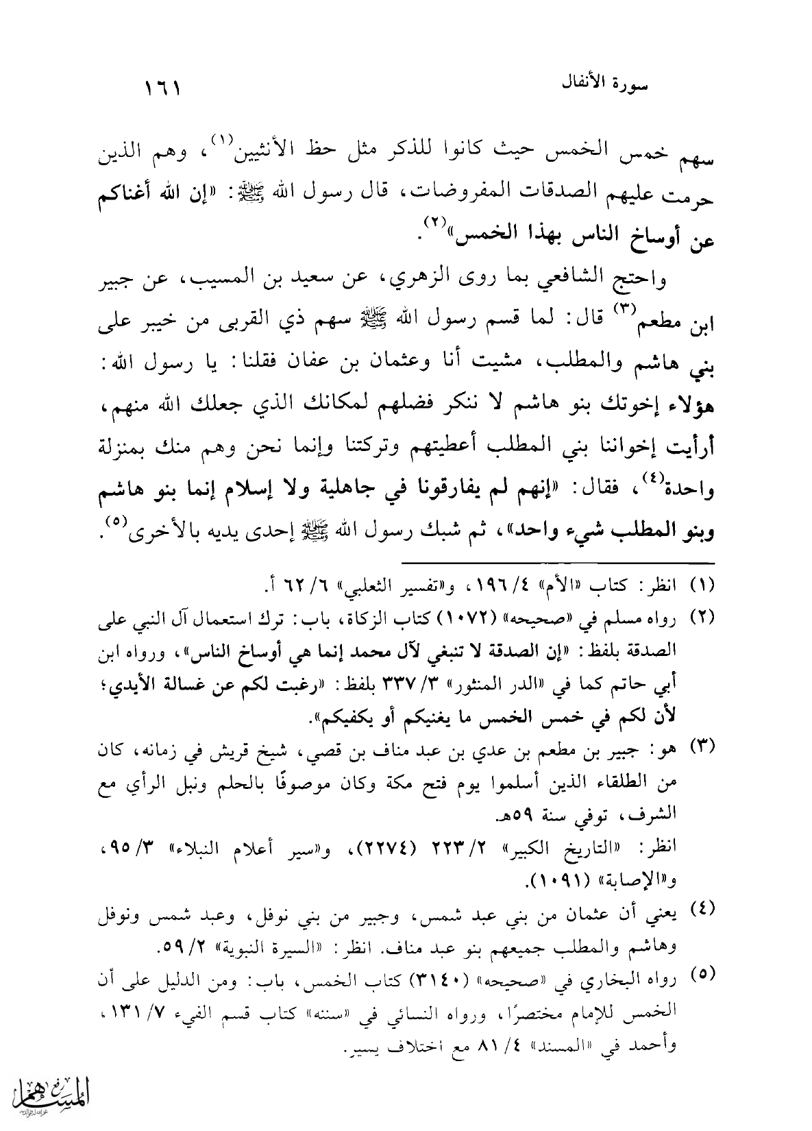 (¬5) رواه البخاري في "صحيحه" (3140) كتاب الخمس، باب: ومن الدليل على أن الخمس للإمام مختصرًا، ورواه النسائي في "سننه" كتاب قسم الفيء 7/ 131, وأحمد في "المسند" 4/ 81 مع اختلاف يسير.
