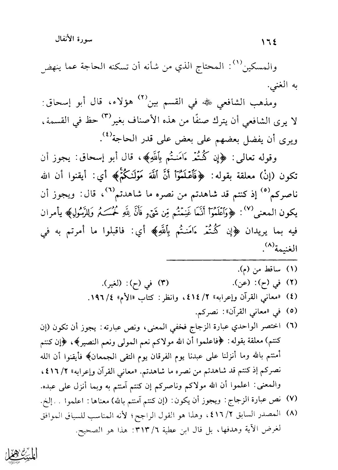 (¬6) اختصر الواحدي عبارة الزجاج فخفي المعنى، ونص عبارته: يجوز أن تكون (إن كنتم) معلقة بقوله: {فَاعْلَمُوا أَنَّ اللَّهَ مَوْلَاكُمْ نِعْمَ الْمَوْلَى وَنِعْمَ النَّصِيرُ}، {إِنْ كُنْتُمْ آمَنْتُمْ بِاللَّهِ وَمَا أَنْزَلْنَا عَلَى عَبْدِنَا يَوْمَ الْفُرْقَانِ يَوْمَ الْتَقَى الْجَمْعَانِ} فأيقنوا أن الله نصركم إذ كنتم قد شاهدتم من نصره ما شاهدتم. "معاني القرآن وإعرابه" 2/ 416، والمعنى: اعلموا أن الله مولاكم وناصركم إن كنتم آمنتم به وبما أنزل على عبده.