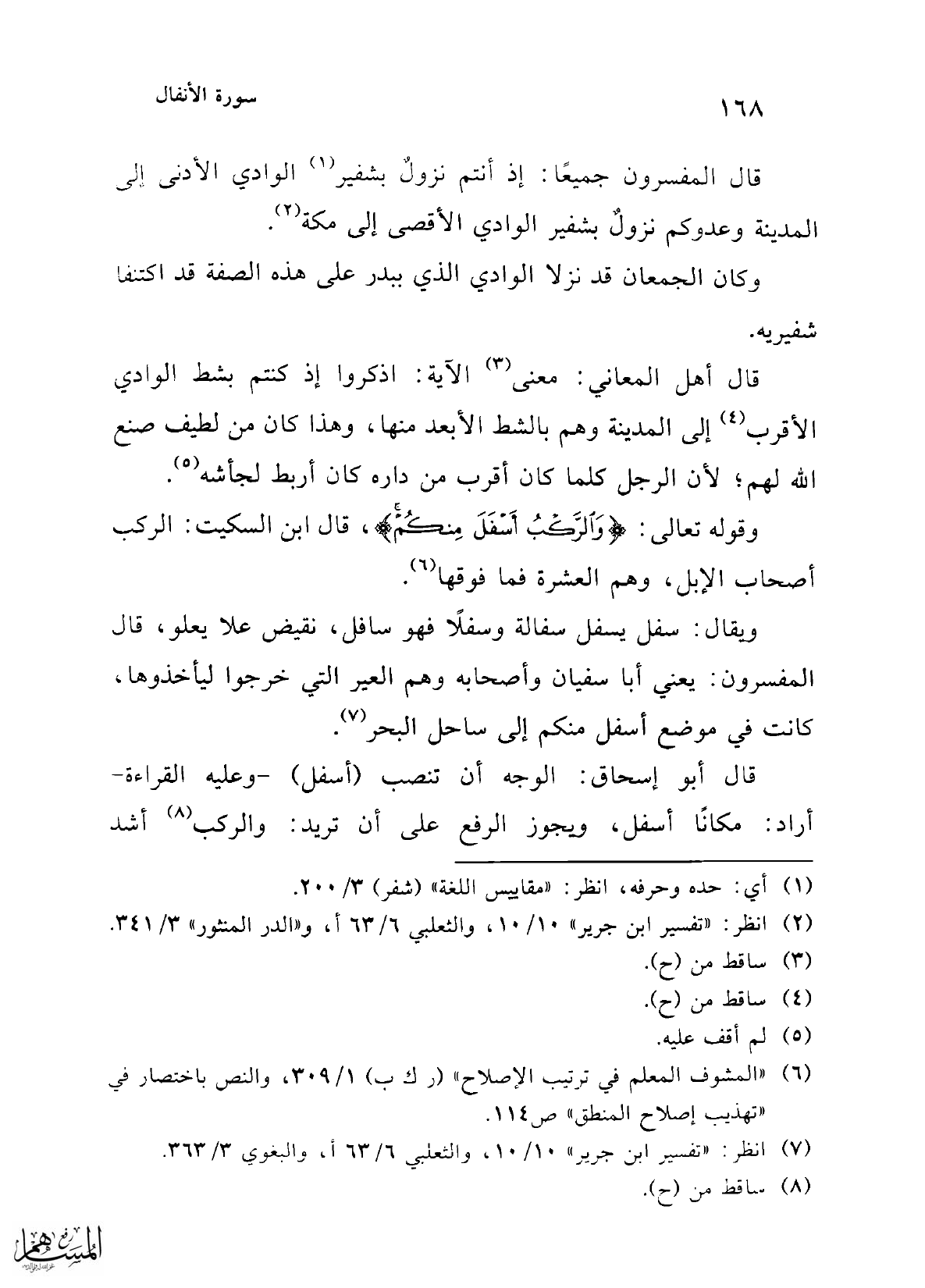 ويقال: سفل يسفل سفاله وسفلًا فهو سافل، نقيض علا يعلو، قال المفسرون: يعني أبا سفيان وأصحابه وهم العير التي خرجوا ليأخذوها، كانت في موضع أسفل منكم إلى ساحل البحر (¬7).
