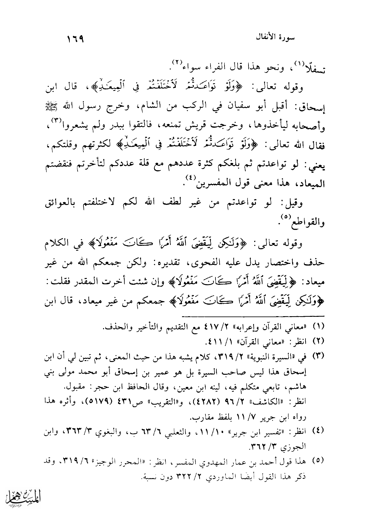 وقوله تعالى: {وَلَوْ تَوَاعَدْتُمْ لَاخْتَلَفْتُمْ فِي الْمِيعَادِ}، قال ابن إسحاق: أقبل أبو سفيان في الركب من الشام، وخرج رسول الله - صلى الله عليه وسلم - وأصحابه ليأخذوها، وخرجت قريش تمنعه، فالتقوا ببدر ولم يشعروا (¬3)، فقال الله تعالى: {وَلَوْ تَوَاعَدْتُمْ لَاخْتَلَفْتُمْ فِي الْمِيعَادِ} لكثرتهم وقلتكم، يعني: لو تواعدتم ثم بلغكم كثرة عددهم مع قلة عددكم لتأخرتم وفنقضتم الميعاد، هذا معنى قول المفسرين (¬4).