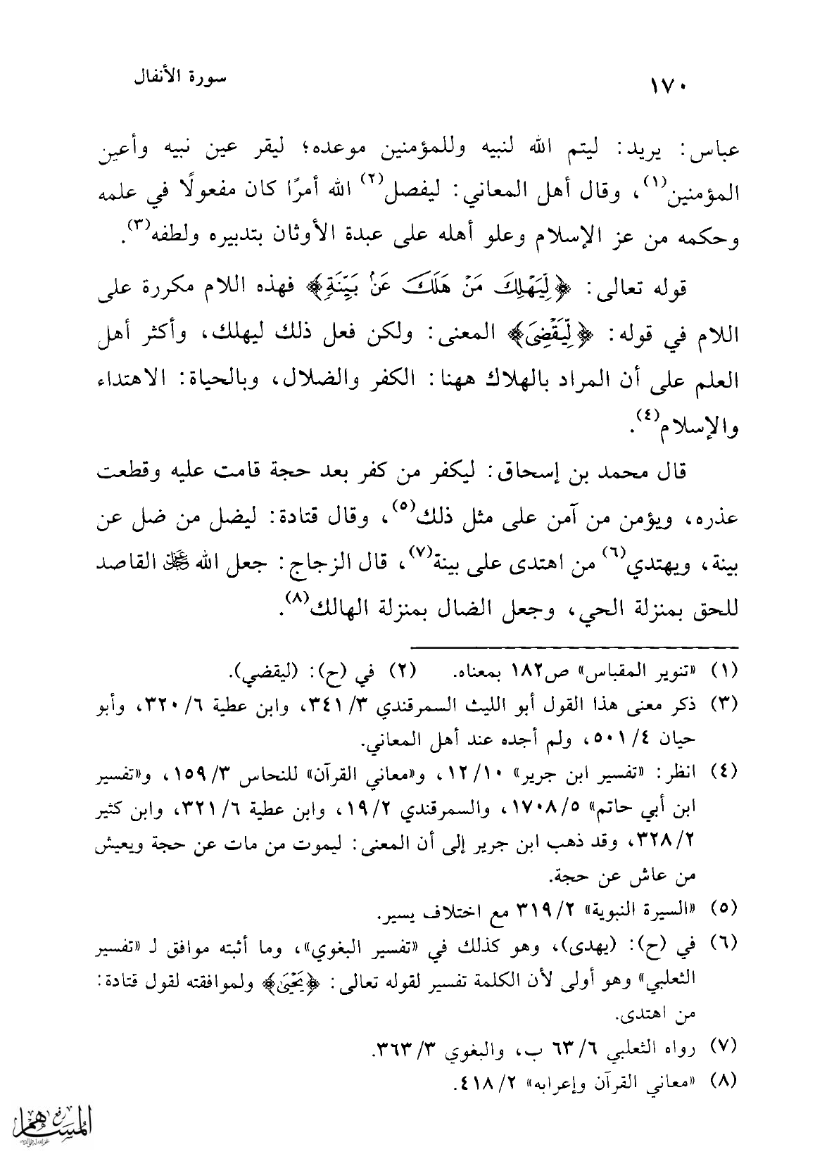 (¬4) انظر: "تفسير ابن جرير" 10/ 12، و"معاني القرآن" للنحاس 3/ 159، و"تفسير ابن أبي حاتم" 5/ 1708، والسمرقندي 2/ 19، وابن عطية 6/ 321، وابن كثير 2/ 328، وقد ذهب ابن جرير إلى أن المعنى: ليموت من مات عن حجة ويعيش من عاش عن حجة.
