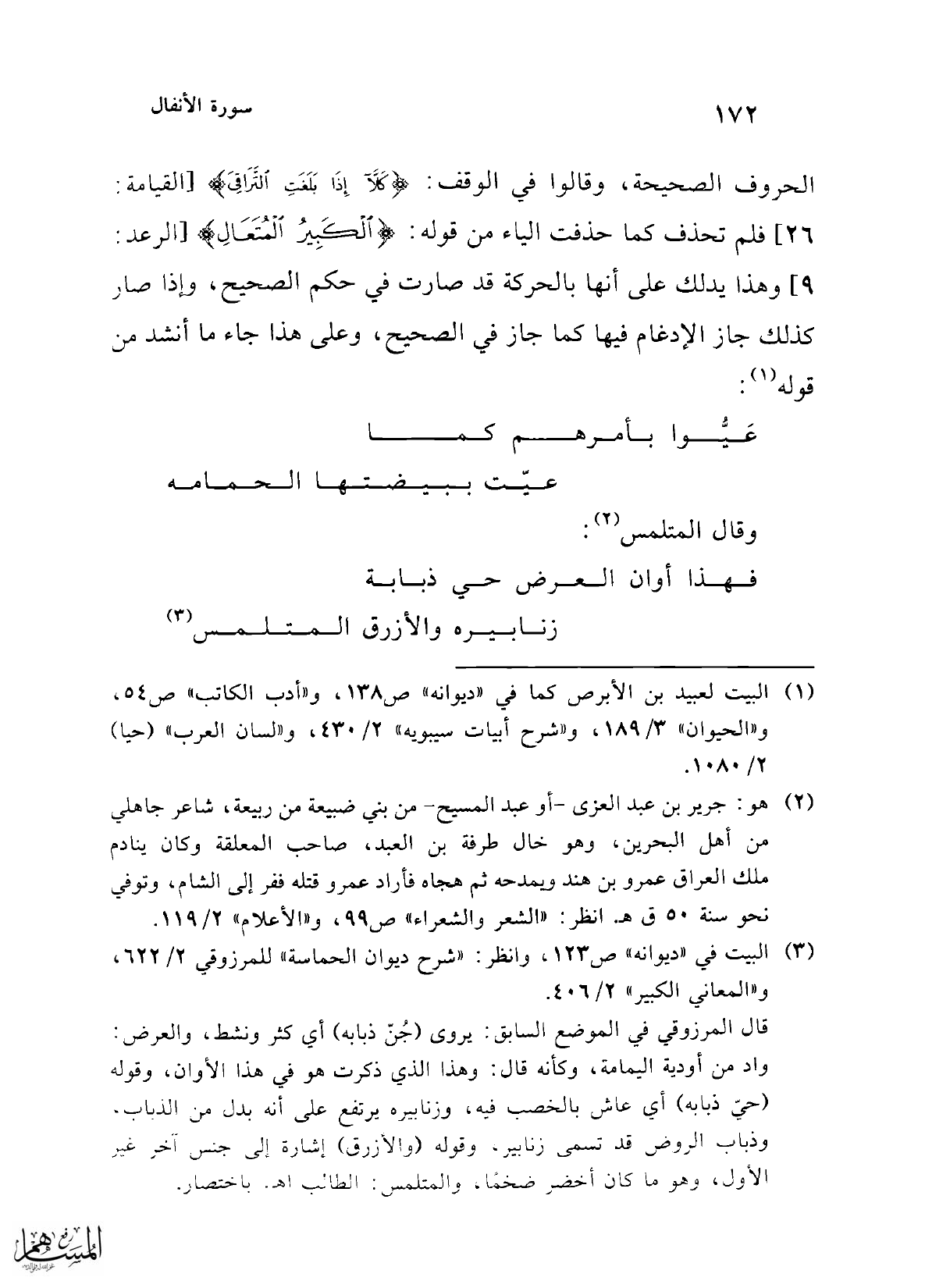 (¬2) هو: جرير بن عبد العزى -أو عبد المسيح- من بني ضبيعة من ربيعة، شاعر جاهلي من أهل البحرين، وهو خال طرفة بن العبد، صاحب المعلقة وكان ينادم ملك العراق عمرو بن هند ويمدحه ثم هجاه فأراد عمرو قتله ففر إلى الشام، وتوفي نحو سنة 50 ق هـ. انظر: "الشعر والشعراء" ص 99، و"الأعلام" 2/ 119.