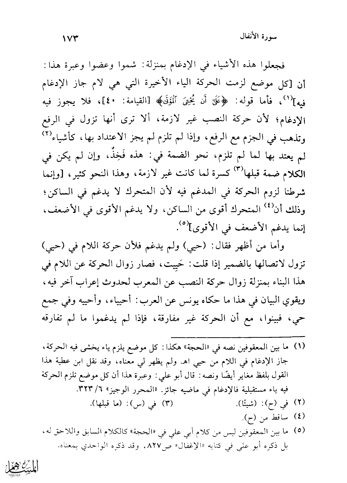 (¬1) ما بين المعقوفين نصه في "الحجة" هكذا: كل موضع يلزم ياء يخشى فيه الحركة، جاز الإدغام في اللام من حيي اهـ، ولم يظهر لي معناه، وقد نقل ابن عطية هذا القول بلفظ مغاير أيضًا ونصه: قال أبو علي: وعبرة هذا أن كل موضع تلزم الحركة فيه ياء مستقبلية فالإدغام في ماضيه جائز. "المحرر الوجيز" 6/ 323.