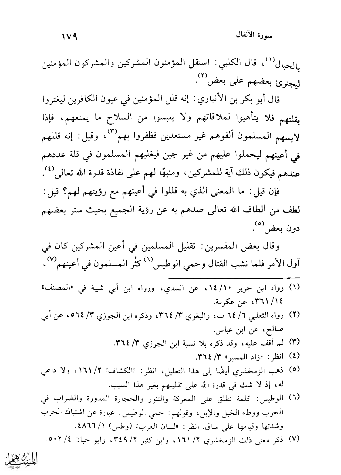 (¬5) ذهب الزمخشري أيضًا إلى هذا التعليل، انظر: "الكشاف" 2/ 161، ولا داعي له، إذ لا شك في قدرة الله على تقليلهم بغير هذا السبب.