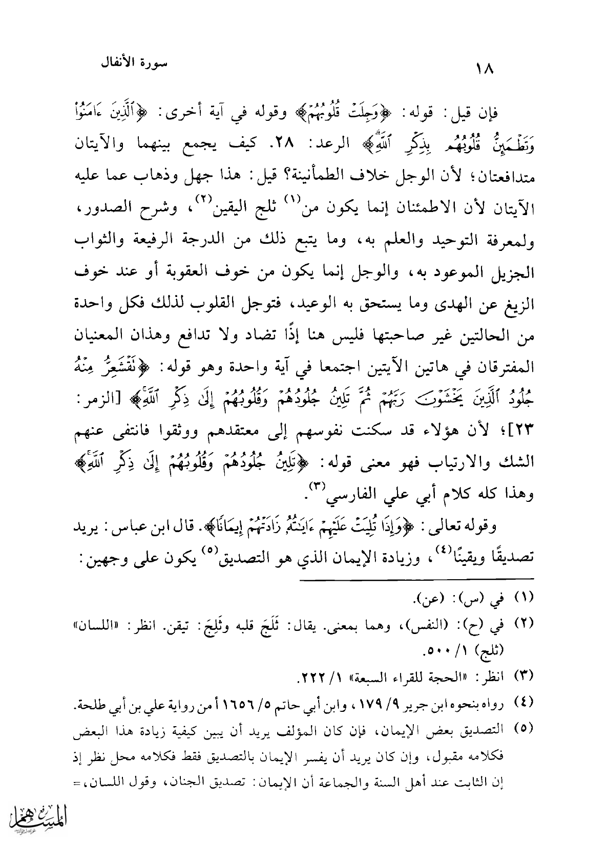 فإن قيل: قوله: {وَجِلَتْ قُلُوبُهُمْ} وقوله في آية أخرى: {الَّذِينَ آمَنُوا وَتَطْمَئِنُّ قُلُوبُهُمْ بِذِكْرِ اللَّهِ} الرعد: 28. كيف يجمع بينهما والآيتان متدافعتان؛ لأن الوجل خلاف الطمأنينة؟ قيل: هذا جهل وذهاب عما عليه الآيتان لأن الاطمئنان إنما يكون من (¬1) ثلج اليقين (¬2)، وشرح الصدور، ولمعرفة التوحيد والعلم به، وما يتبع ذلك من الدرجة الرفيعة والثواب الجزيل الموعود به، والوجل إنما يكون من خوف العقوبة أو عند خوف الزيغ عن الهدى وما يستحق به الوعيد، فتوجل القلوب لذلك فكل واحدة من الحالتين غير صاحبتها فليس هنا إذًا تضاد ولا تدافع وهذان المعنيان المفترقان في هاتين الآيتين اجتمعا في آية واحدة وهو قوله: {تَقْشَعِرُّ مِنْهُ جُلُودُ الَّذِينَ يَخْشَوْنَ رَبَّهُمْ ثُمَّ تَلِينُ جُلُودُهُمْ وَقُلُوبُهُمْ إِلَى ذِكْرِ اللَّهِ} [الزمر: 23]؛ لأن هؤلاء قد سكنت نفوسهم إلى معتقدهم ووثقوا فانتفى عنهم الشك والارتياب فهو معنى قوله: {تَلِينُ جُلُودُهُمْ وَقُلُوبُهُمْ إِلَى ذِكْرِ اللَّهِ} وهذا كله كلام أبي علي الفارسي (¬3).